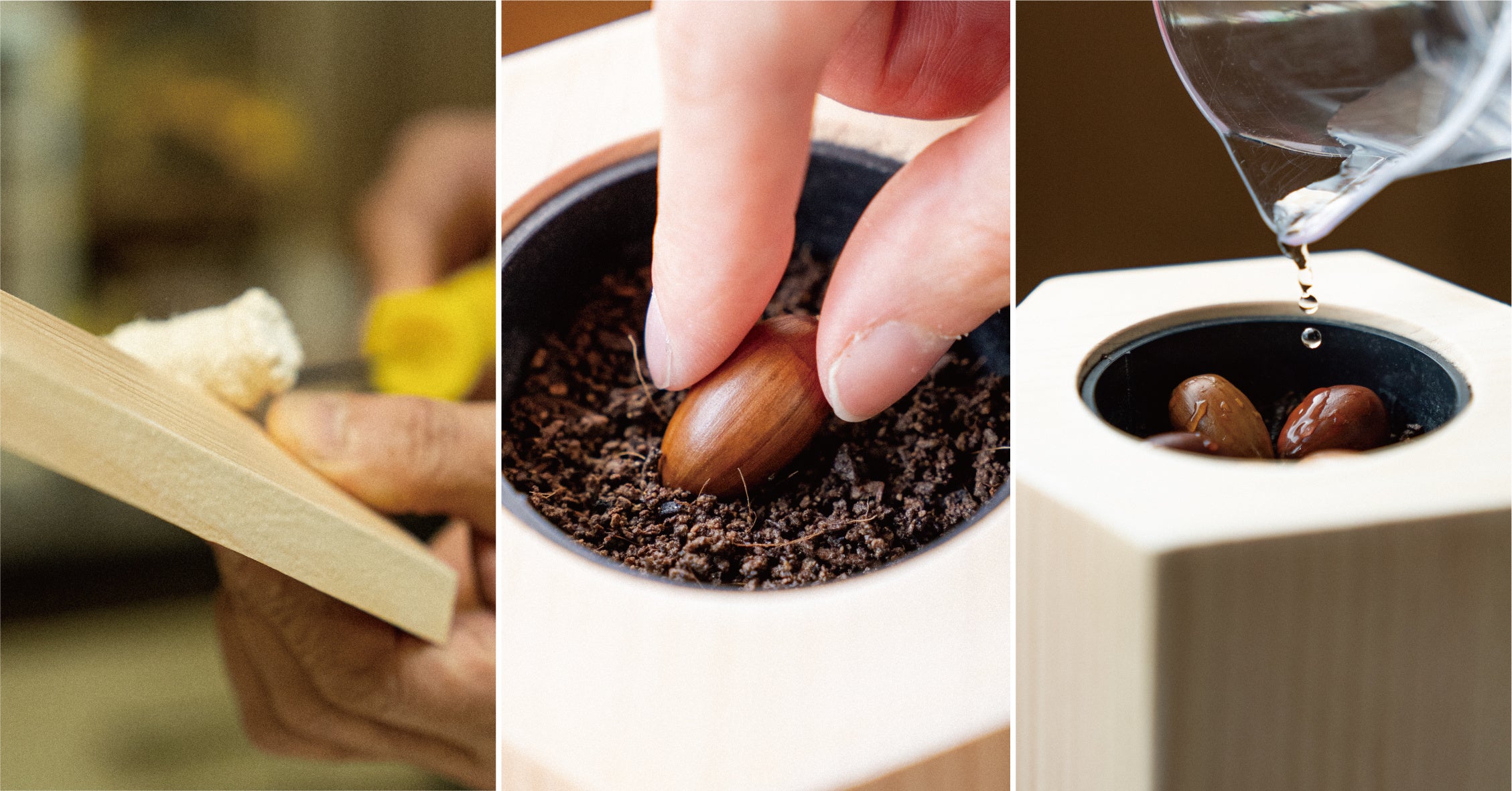 戻り苗に入っているのは、どんぐり、木鉢、コンテナ、土、栄養剤など...どれも、家庭やオフィス、教育現場などの室内で元気に育つよう、樹木医のアドバイスを受けながら選定しました。国産ヒノキで作った木鉢は、香りと手触りを楽しんでいただけるように拘って、和歌山県田辺市の職人が一つ一つ手で作っています。