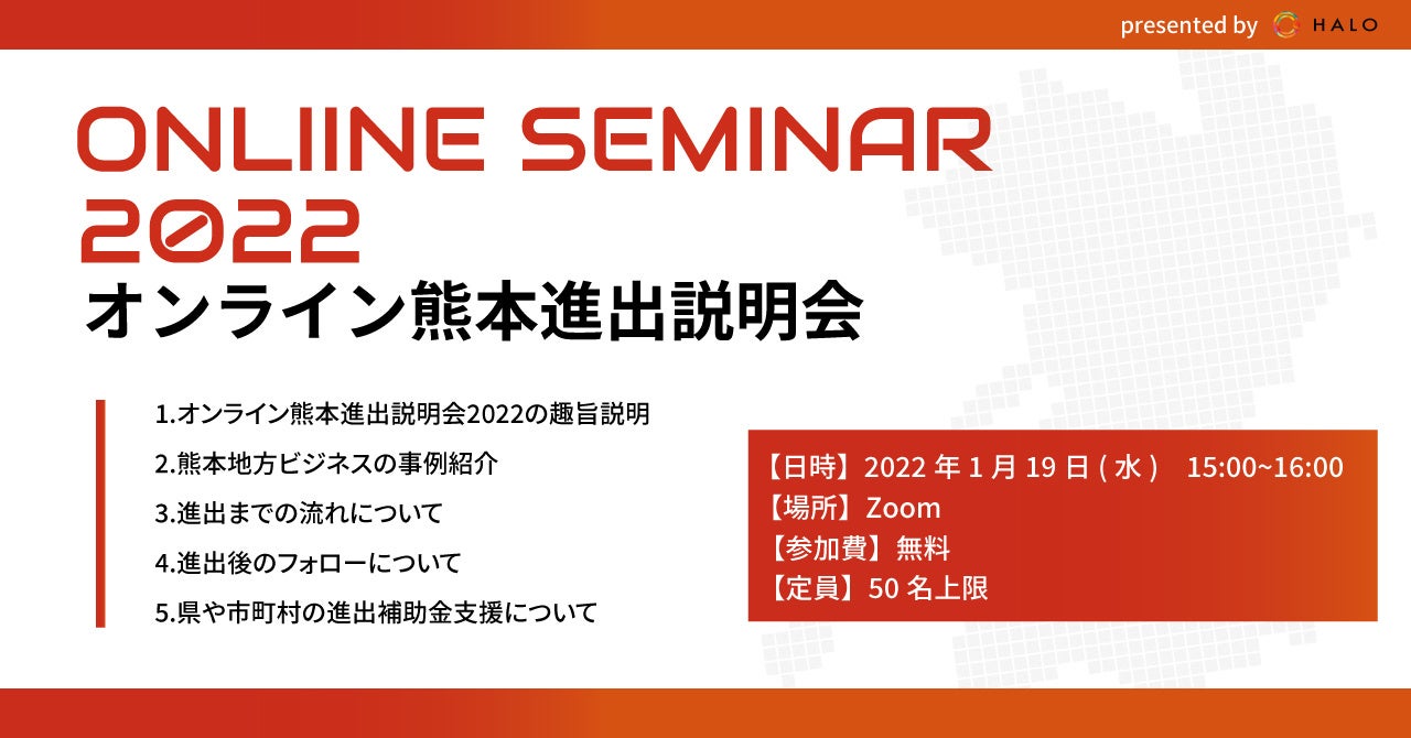 一般社団法人HALO(本社:熊本県芦北町、代表理事:小山 光由樹)は、進出企業が集まる企業注目の地「熊本」へのオンライン進出説明会を実施致します。
