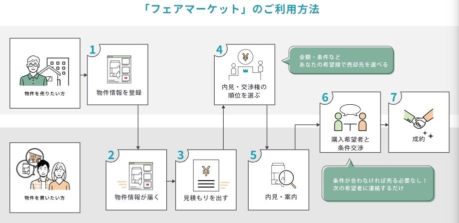 主に東京23区を中心としたマンションオーナーと購入検討中ユーザーが、直接的に売買に向けた入札や交渉を行い、売買の合意形成後は同社が契約業務の代行を行う仕組みで、これまで難しいとされてきた不動産売買の個人間取引実現に、大幅に近づくサービスとなっています。