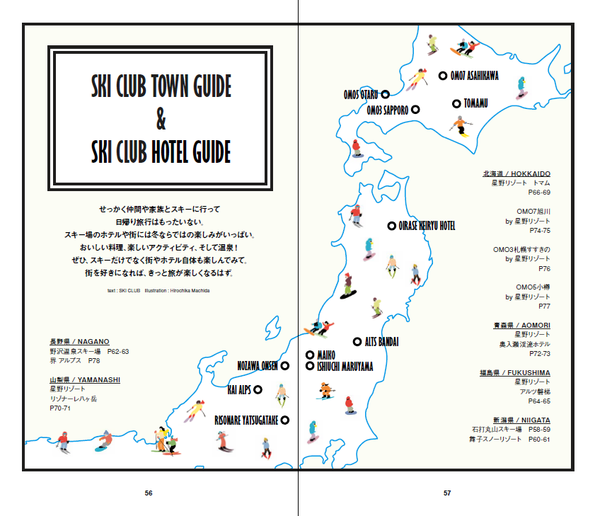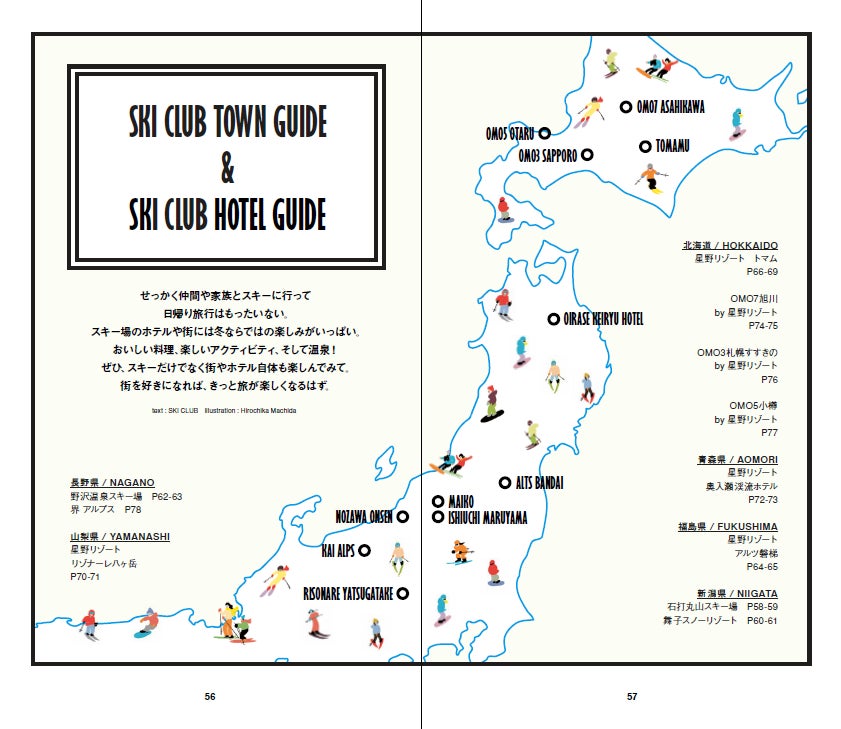 グルメに温泉に冬の絶景! スキーの楽しみは滑るだけじゃない。北は北海道から南は長野まで、魅力満載のスキータウンとホテルを、楽しさ溢れるイラストで紹介するSKI CLUB的タウン&ホテルガイド