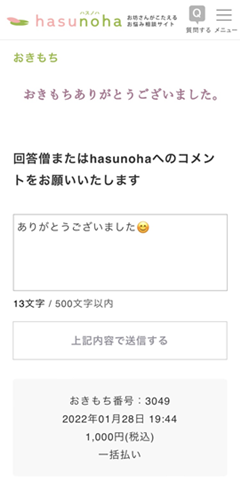 コロナ禍での社会不安の増大により、hasunohaでお坊さんに相談したい人の数がコロナ禍以前に比べて2倍に増えました。相談が殺到する中、お坊さんはボランティアで皆様に寄り添ってくれています。「おきもち」は、お坊さんへの感謝や、hasunohaへの応援として、皆様の任意でお支払いいただくお金です。現在まで、皆様よりクレジットカードか銀行振込から選ぶ「おきもち」を1,800件超いただいていますが、このたびPayPayを追加し、ボタンを押していくだけで簡単に「おきもち」を送れるようしました。
