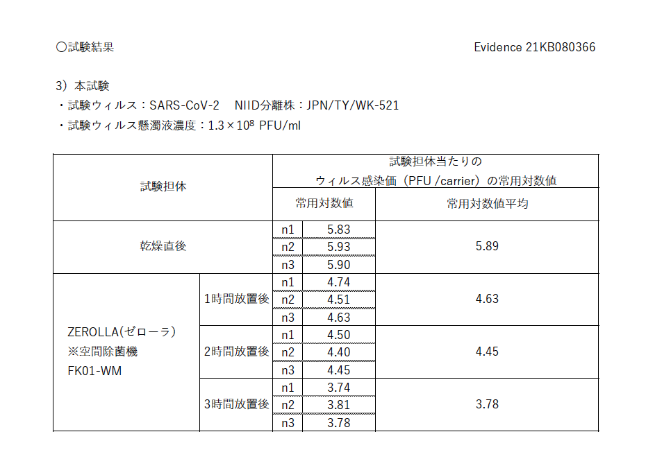 本空間除菌試験では試験ウイルス(新型コロナウイルス:SARS-CoV-2)のウィルス感染価は1時間で4.63、3時間後に3.78で、この数値は試験BOX乾燥直後の数値に比べ、新型コロナウイルスを1時間で94.50%、3時間で99.22%減少させていることを示しています。