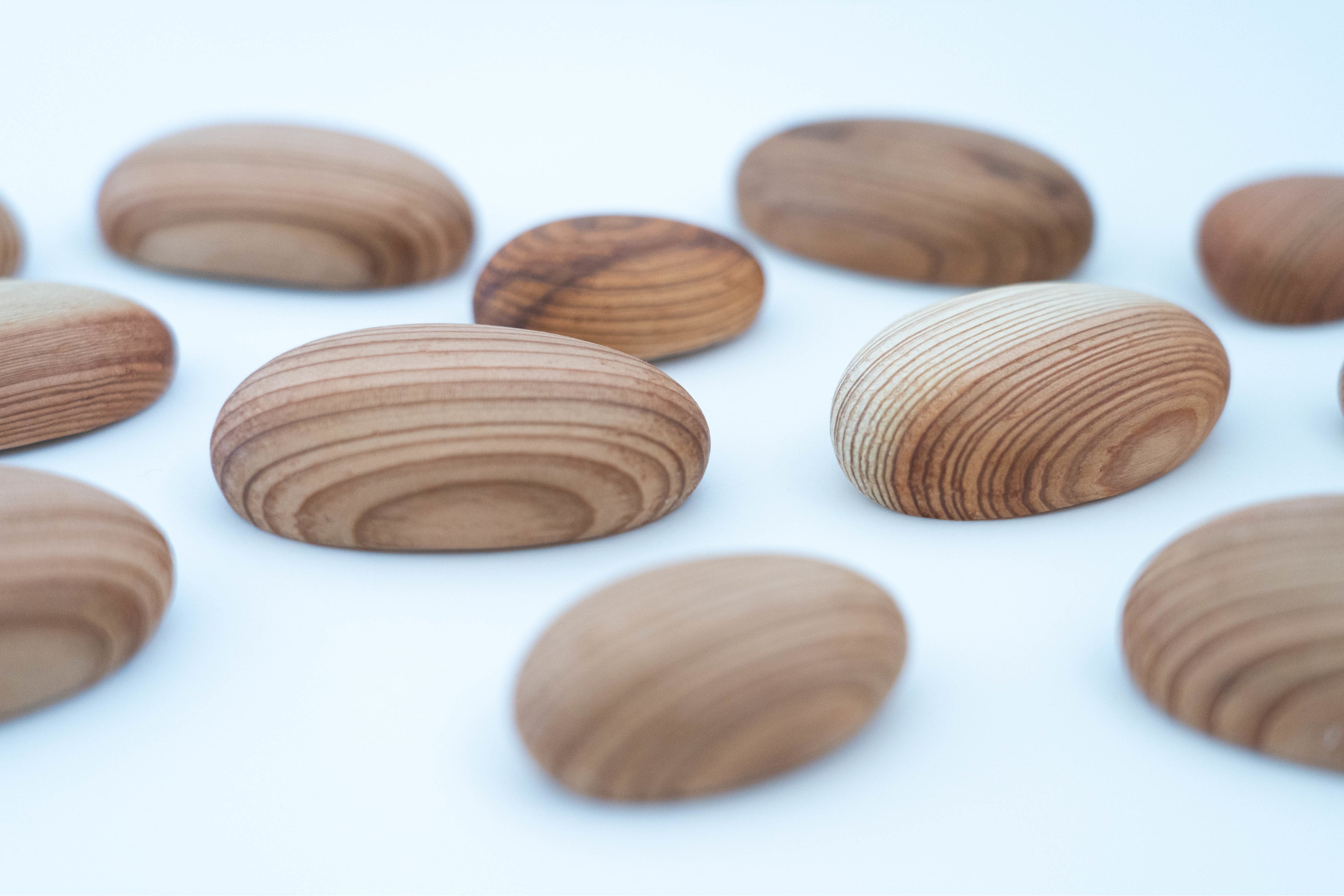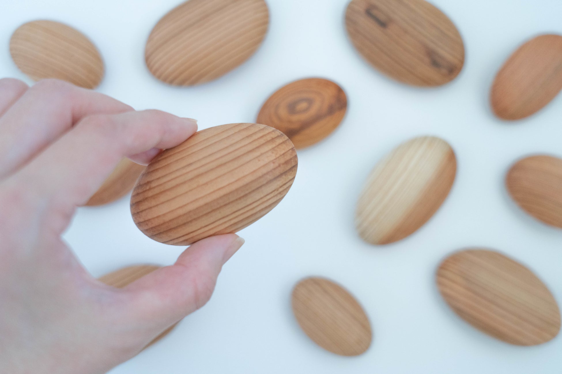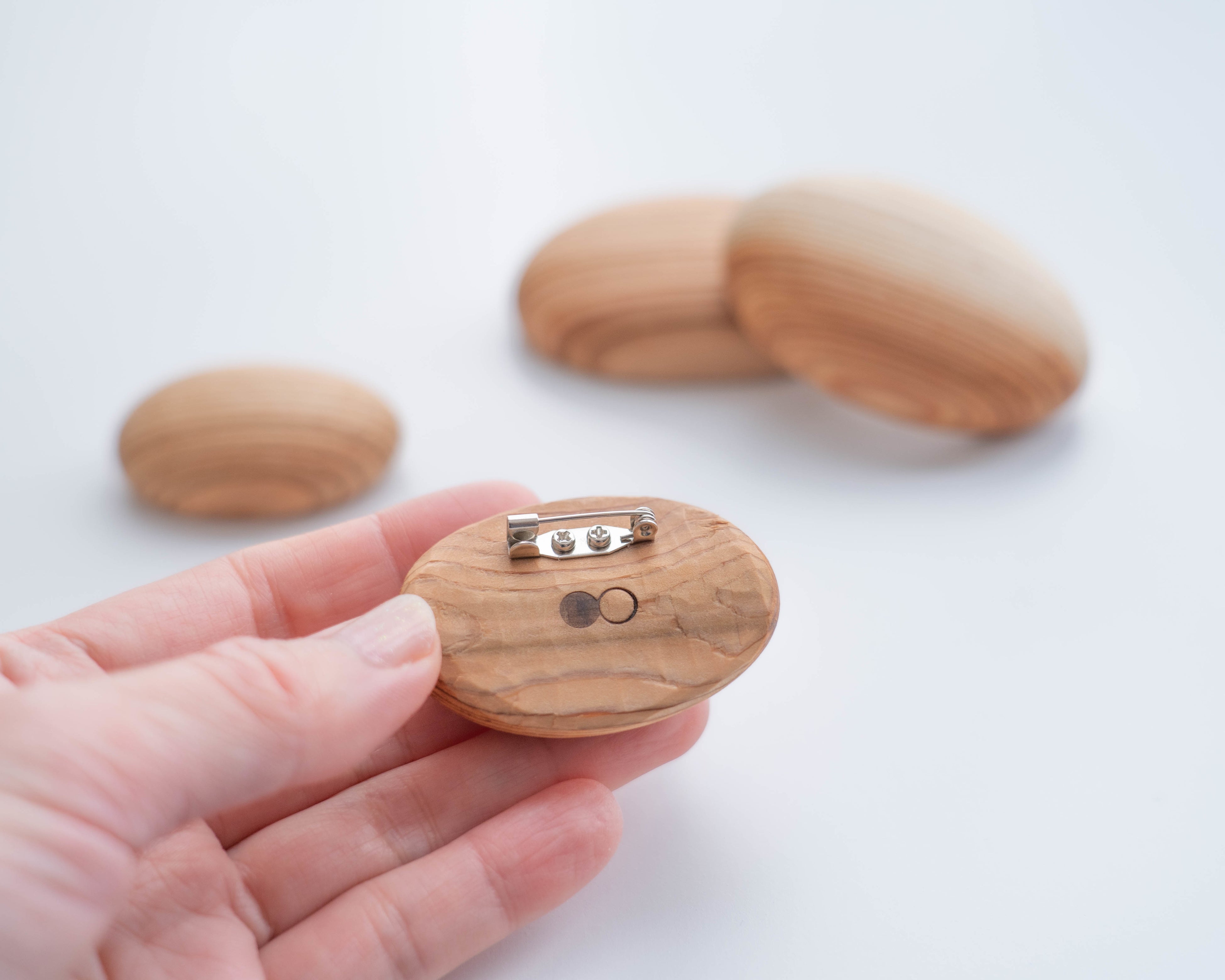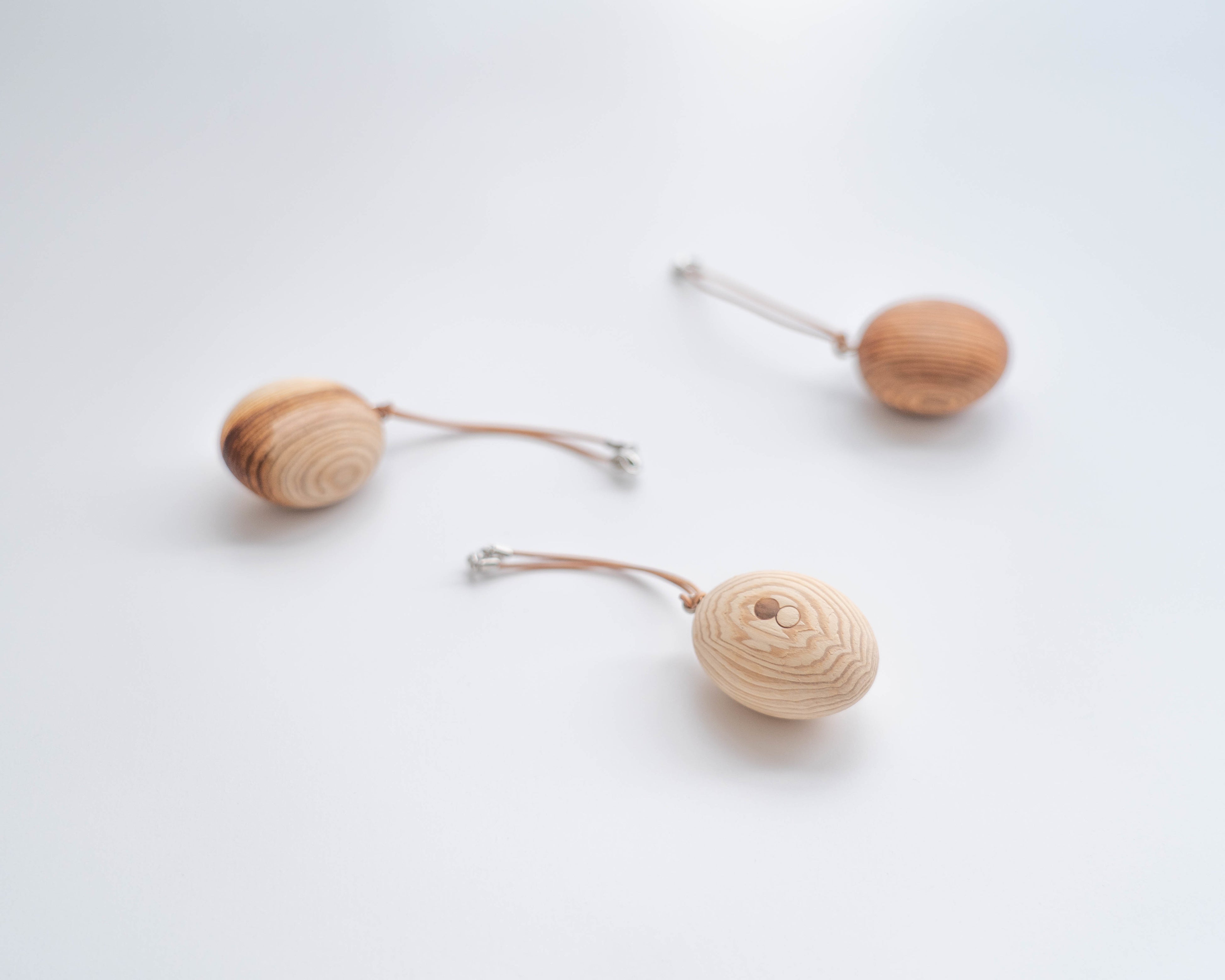 割り箸職人さんの加工技術で削り出してもらった木目も色合いも個性がある一点物のブローチとチャーム。使っていくうちにできる傷や色の変化も風合いとして楽しみながら卵を温めるように自分だけの風合いに育てながら使ってもらいたいと思いを込めたジュエリーです。ブローチ・チャーム ¥3,500〜