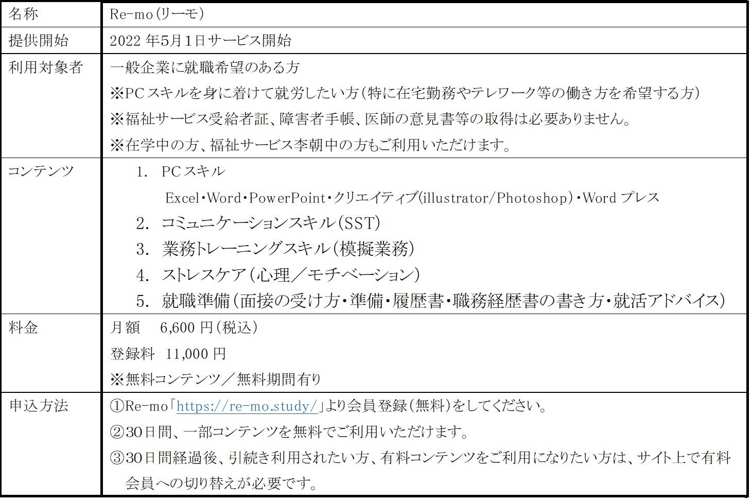 そこで当社は、アフターコロナの働き方を見据えた取り組みとして、一般企業に就労したい方を対象に誰もが今いる場所で学べるe-learningに、就労移行支援のノウハウを組み合わせた新サービスとして、オンライン就労支援「Re-mo」の開発を行いました。