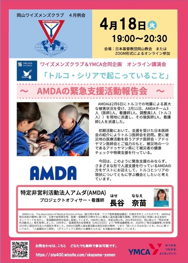 岡山ワイズメンズクラブとYMCAせとうちは、講演会「「トルコ・シリアで起こっていること」~AMDAの緊急支援活動報告会~」を2023年4月18日(火)に日本キリスト教団 岡山教会またはZoomにてリアル&オンライン開催いたします。