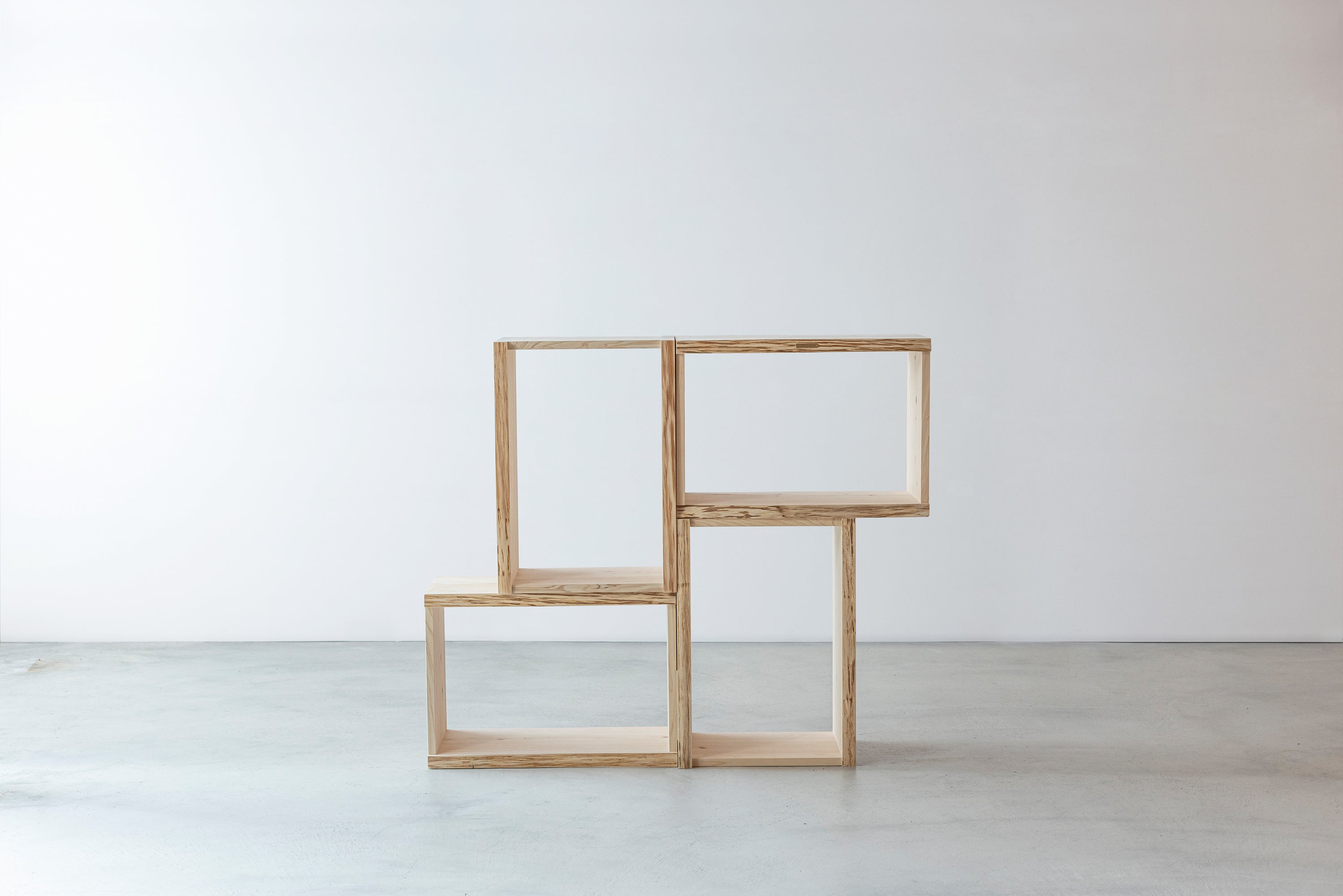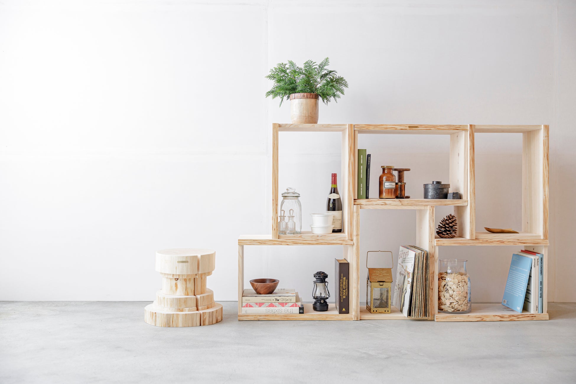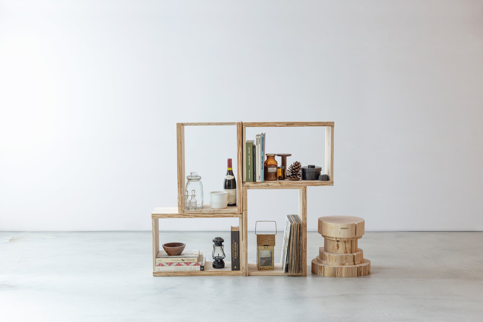 一対の板にヒノキの耳を使ったボックスシェルフ。