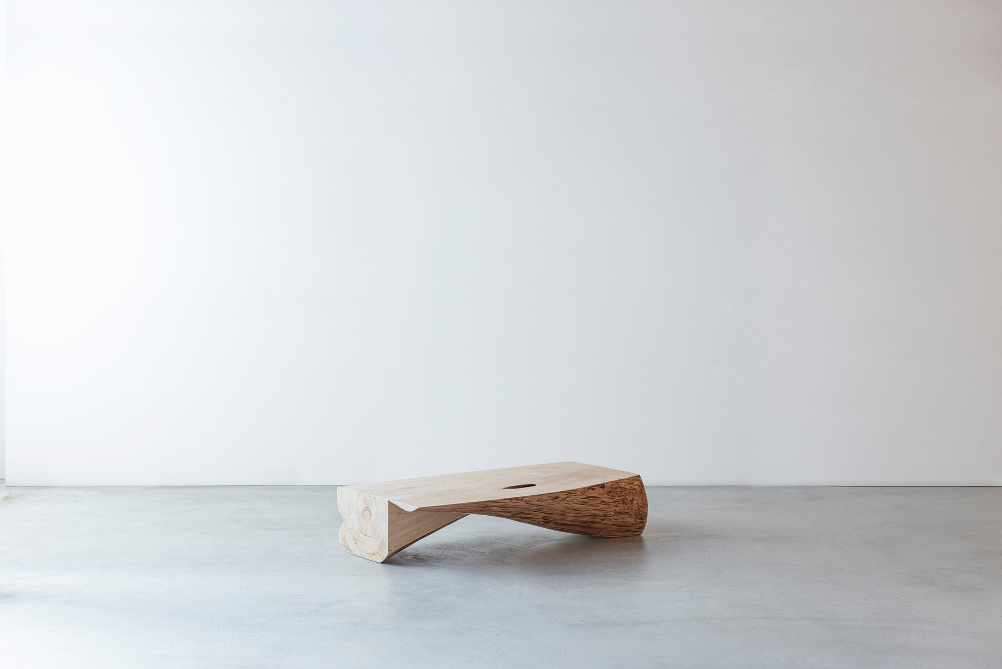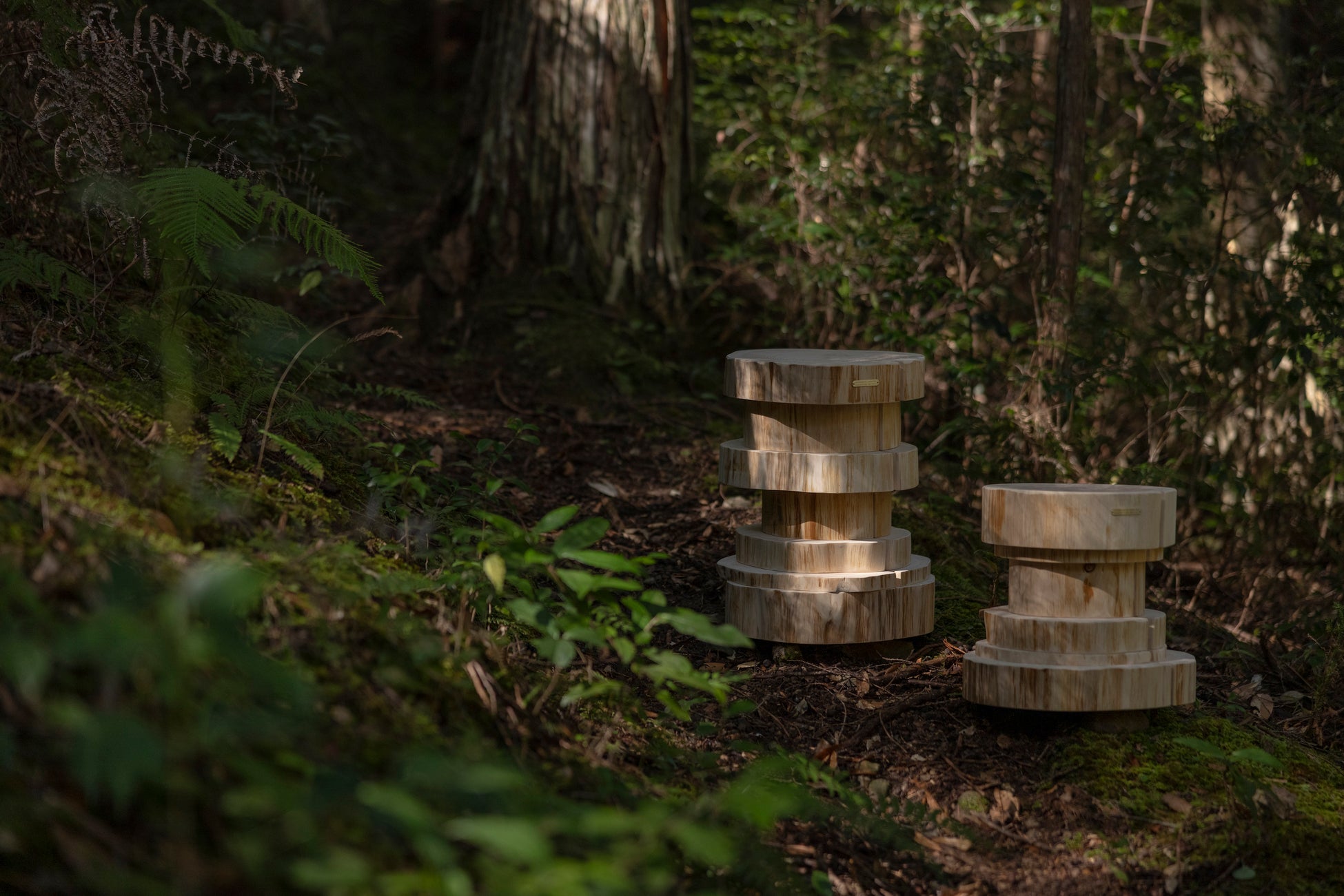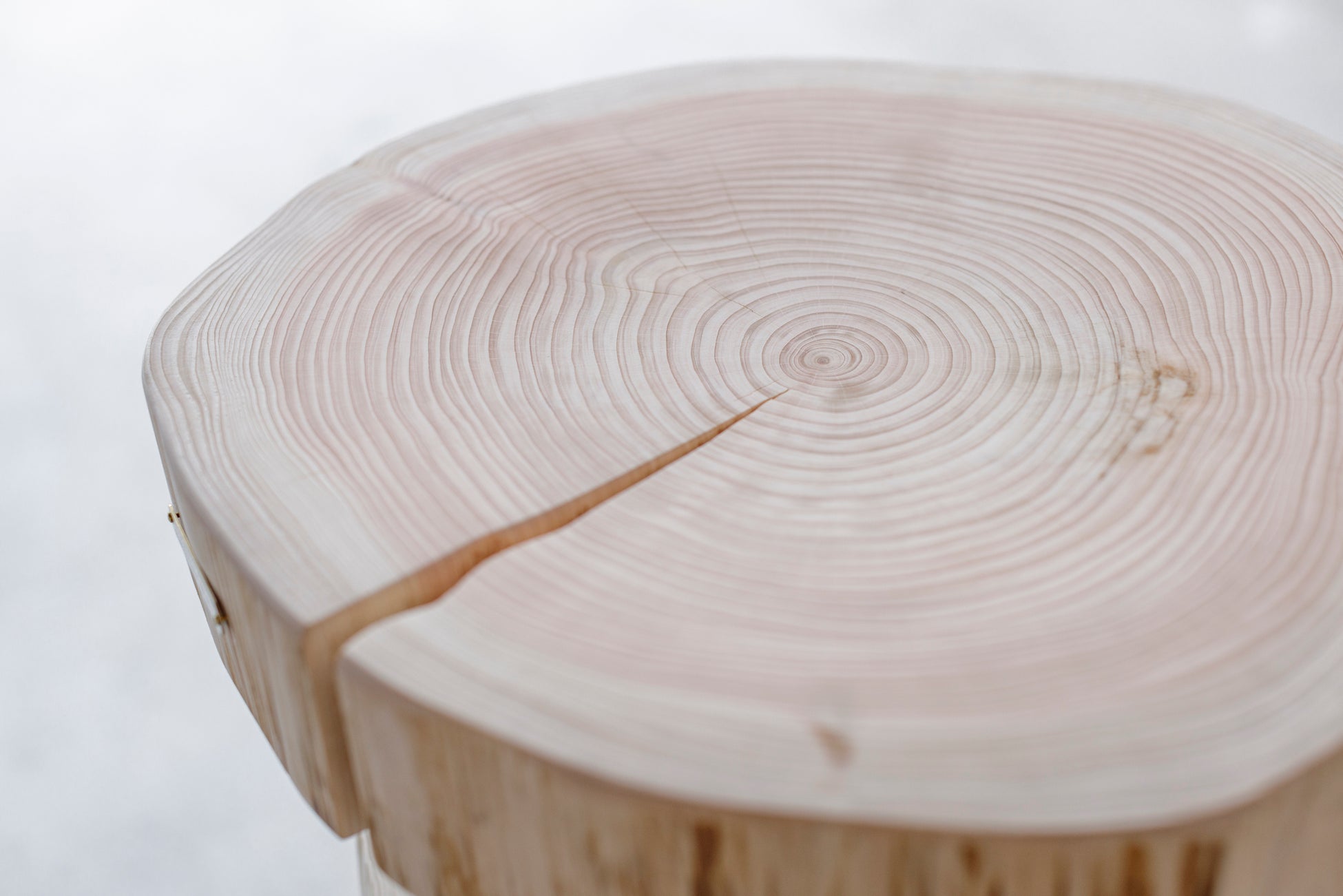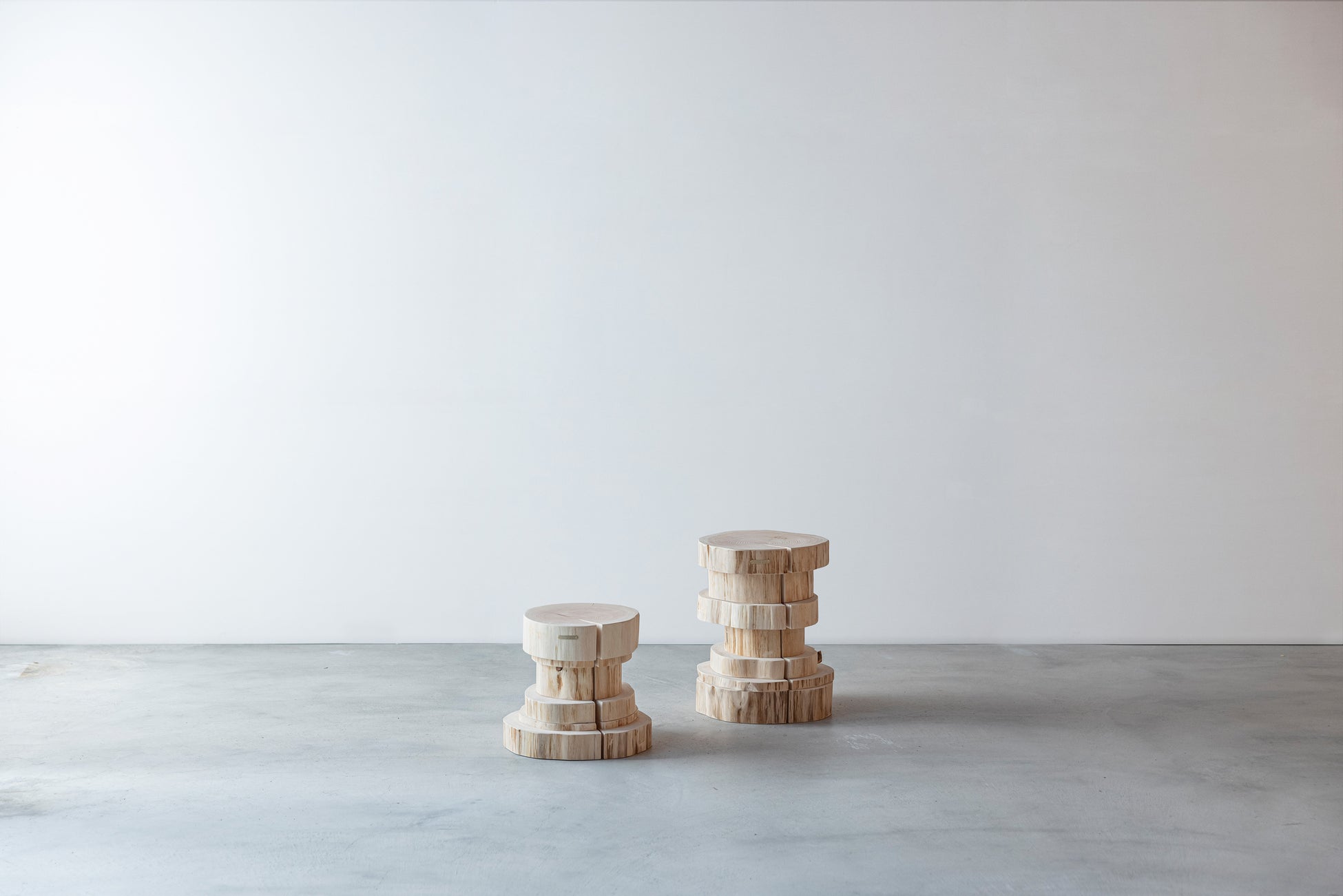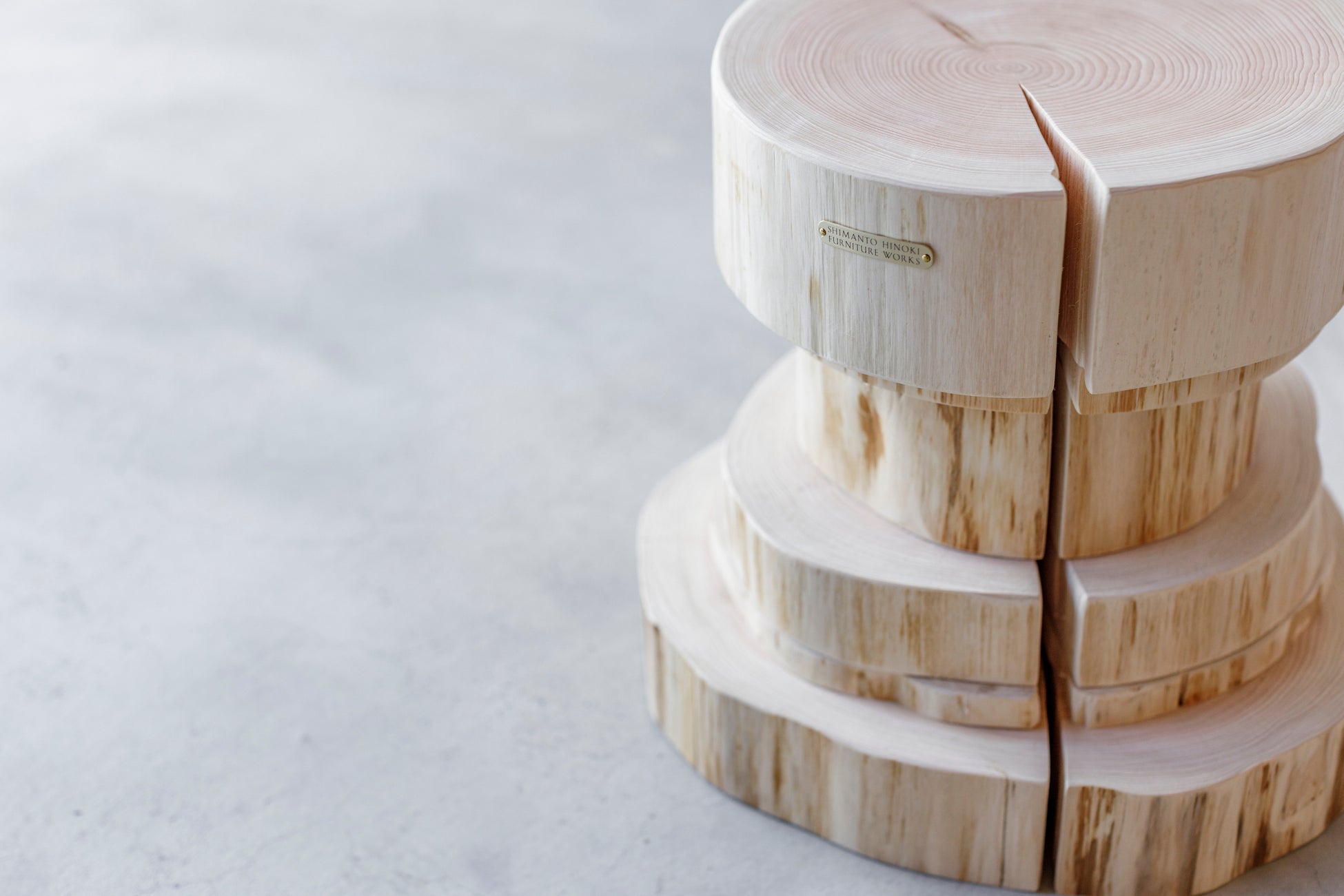 製材の過程で丸太から切り落とされた端材を積み上げたスツール。