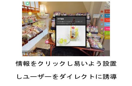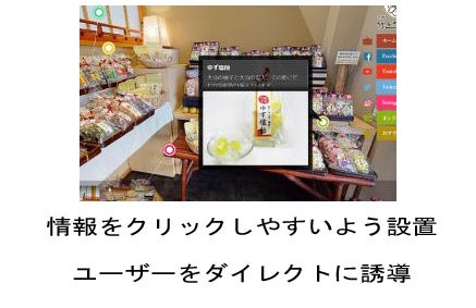 ネット上で再現した空間ではひと目で「店舗の世界感」「商品のディスプレー」が伝わります。タグによって・商品情報のテキスト・イメージ写真・イメージ動画も提供できるので、ご来店以上の情報がいつでも瞬時に発信できます。