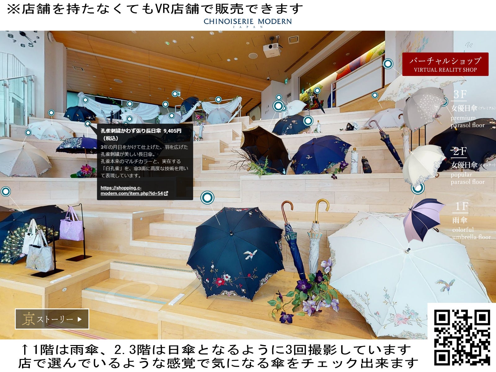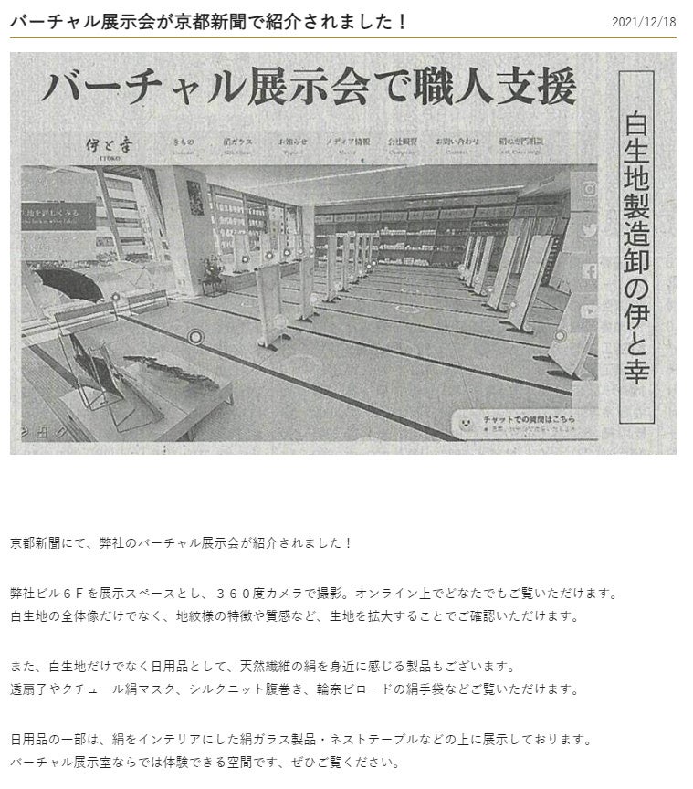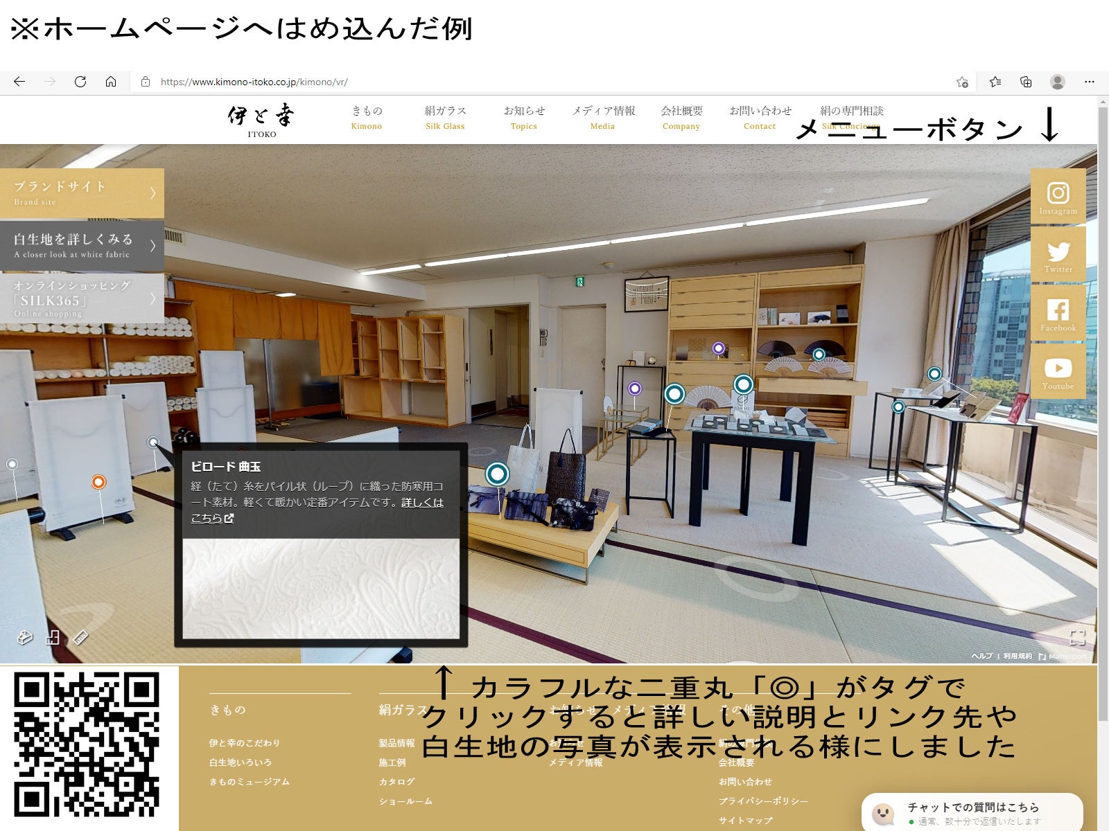 和装業界で広く知られる老舗白生地卸の企業様です。対面での案内や営業が制限されるコロナ禍に、販売機会を増やそうとホームページでバーチャル展示会を始められました。タグでネットショップとリンクさせているので、売り上げが低迷した職人さんの支援にも繋がっています。展示品は白生地を主役に和装小物、絹を使用した装飾用建築材料まで様々。90周年を記念してのVR展示で「コロナに負けず伝統の技術を業界の内外へ発信出来た」と喜んで頂けました。地方新聞でも取り上げられ話題になりました。