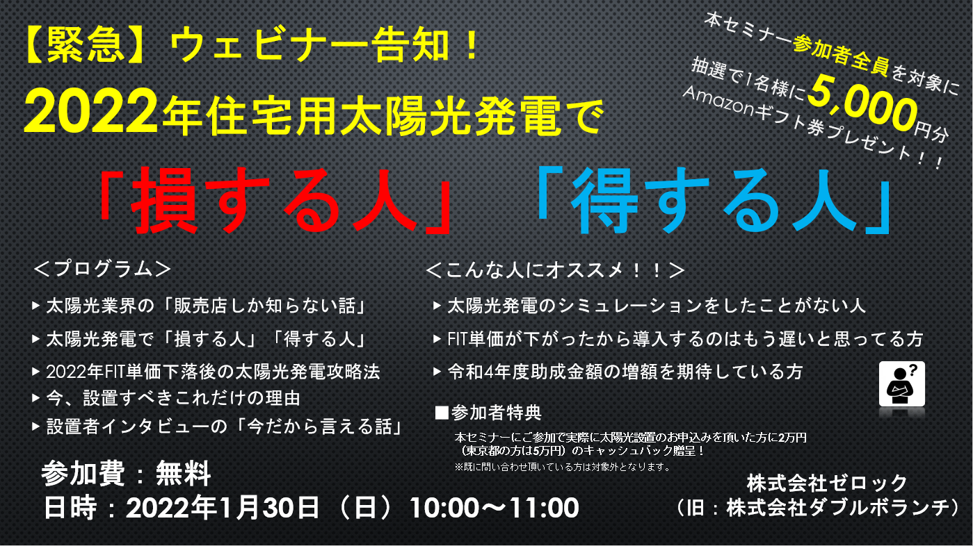 【1/30(日)】無料ウェビナー開催!~2022年住宅用太陽光発電で「損する人」「得する人」~