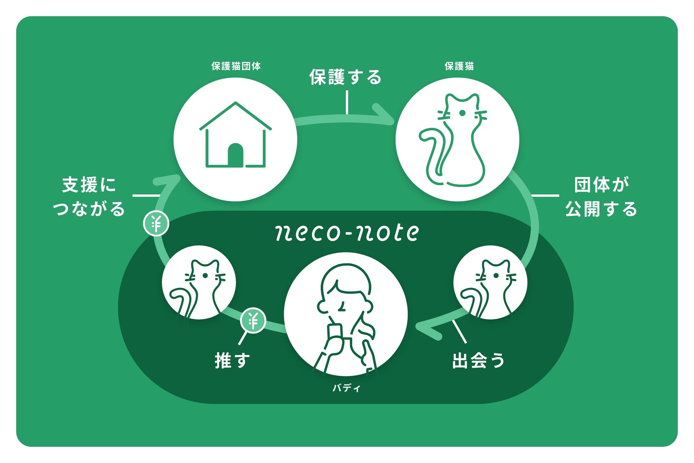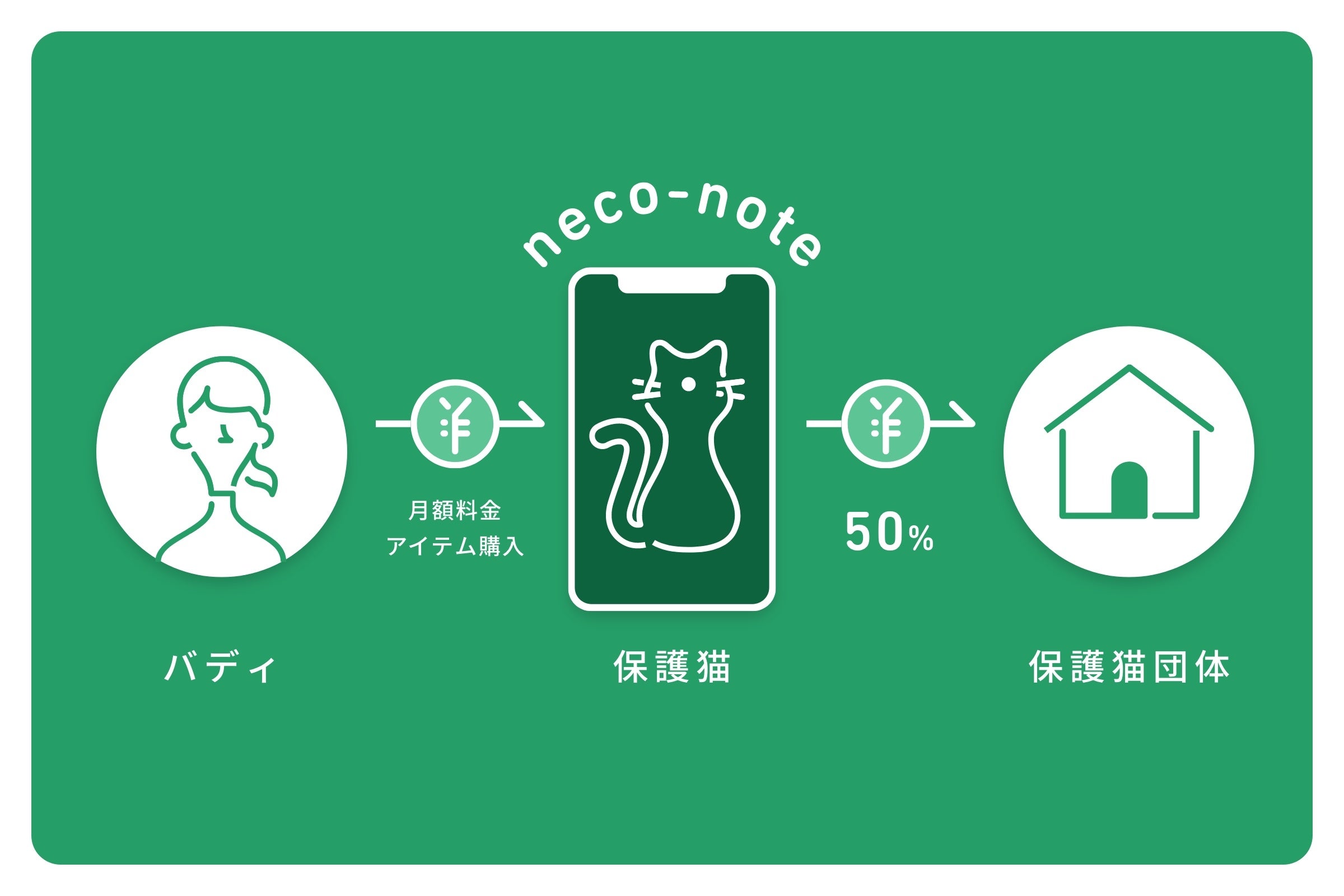 バディによるサービスの利用(推し活)の課金は保護猫団体の活動費となり、団体活動を支えます。保護猫活動では、1頭あたり数万から数十万の医療費や餌代が1ヶ月でかかる場合もあります。一方で収入源を不安定な寄付に頼ってしまっているのが現状です。ここに、一定の収入が見込めることで保護猫団体の活動全体が安定し、より多くの猫を保護することができます。保護された猫が『neco-note』にデビューすることで、バディたちの推し活がもっと盛り上がり、一連の経済循環が大きく成長していきます。