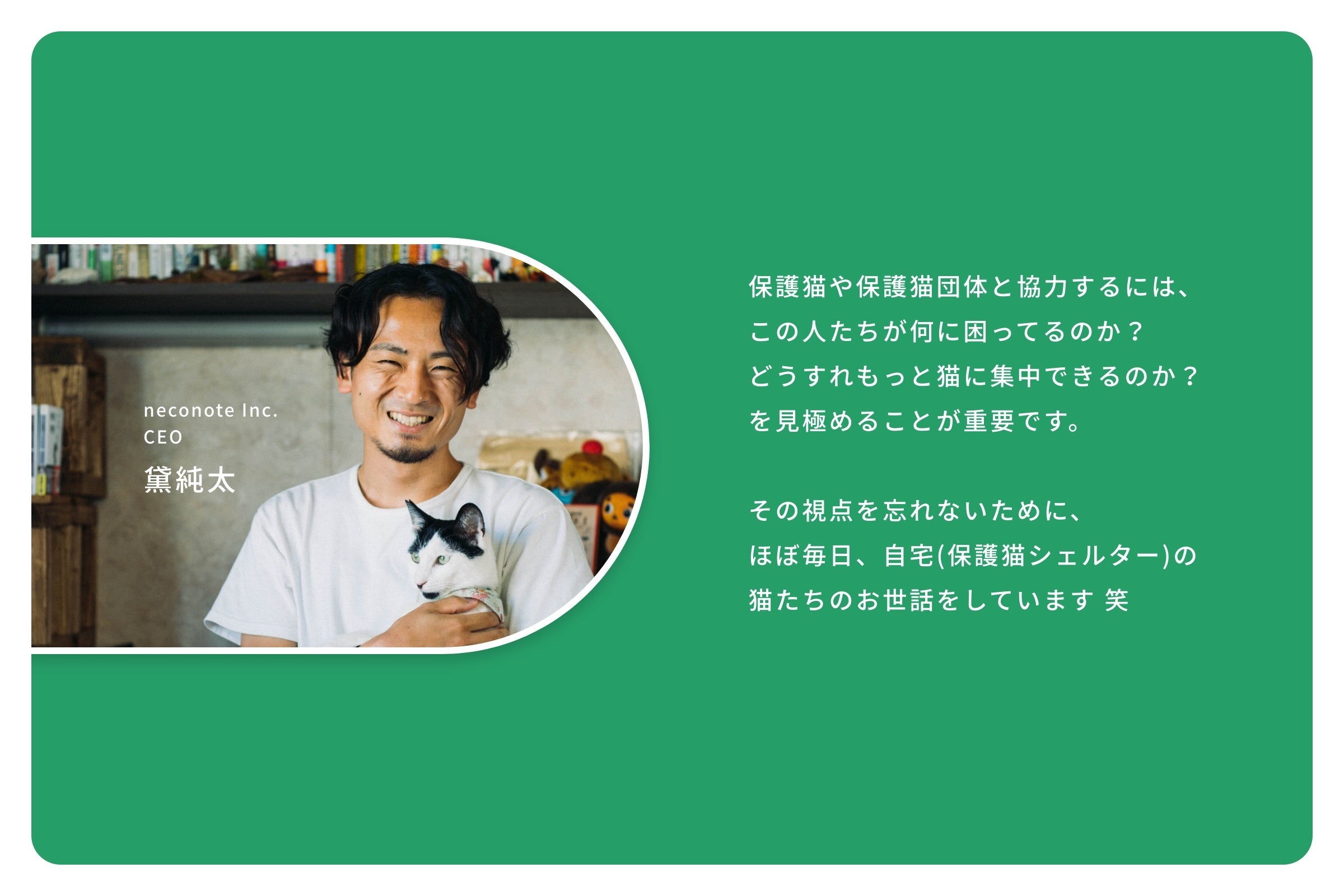 保護猫をもっと身近な存在にしてくれるneco-note。僕たち保護団体ができていなかったIT観点からのアプローチ。まさに、動物先進国そのものの考えです。黛さんは、僕じゃ考えられない新しい発想を普段から持っている存在。この日本の保護活動業界に必要不可欠だと思っています。保護活動には、悲しい現実を伝えるだけでなく、ポジティブに物事を捉えられるビジョンも必要。そのスキーム作りを担ってくれている黛さんに、心から感謝しています。