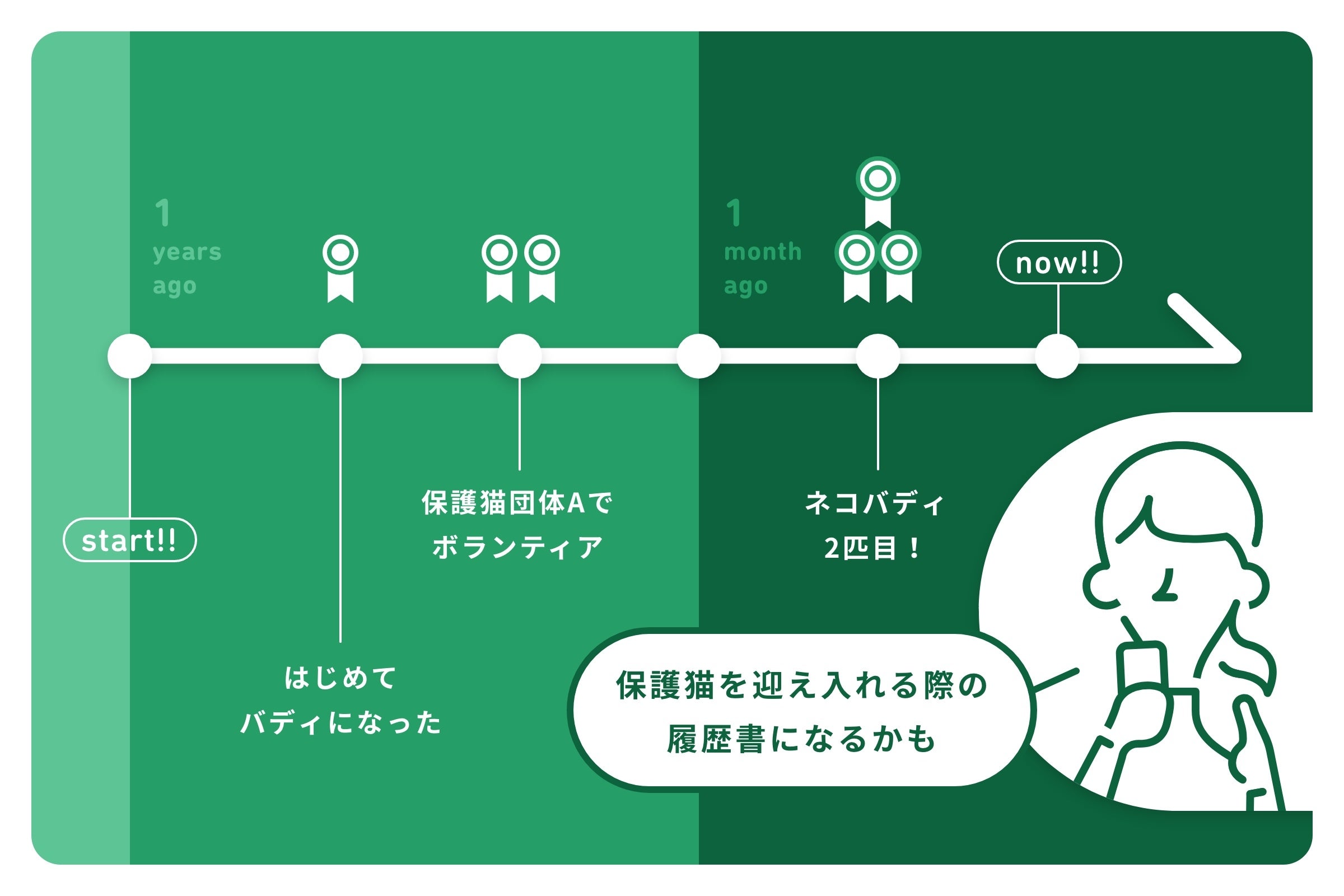 『保護ログ』は、neco-note内での保護猫活動(バディ契約やボランティアなど)の履歴データを蓄積し可視化する機能です。通常、保護猫団体は虐待などが行われないように譲渡希望者の情報を詳しく聞きますが、双方にとって負担が大きいのが課題となっています。『保護ログ』を見せることで、いつから保護猫活動に取り組んできたのかを伝えることができるので、その負担を軽減させることができます。