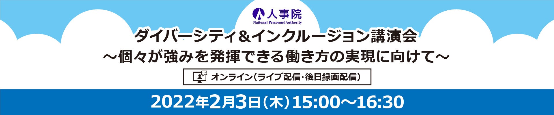 人事院は、「個々が強みを発揮できる働き方の実現に向けて」と題して、組織におけるダイバーシティとインクルージョンをテーマにオンライン講演会を開催します。ジャン・アダムズ駐日オーストラリア大使、髙橋和夫東急株式会社代表取締役社長をお迎えして、多様性の尊重や柔軟な働き方の推進に関する取組を御紹介いただきます。
