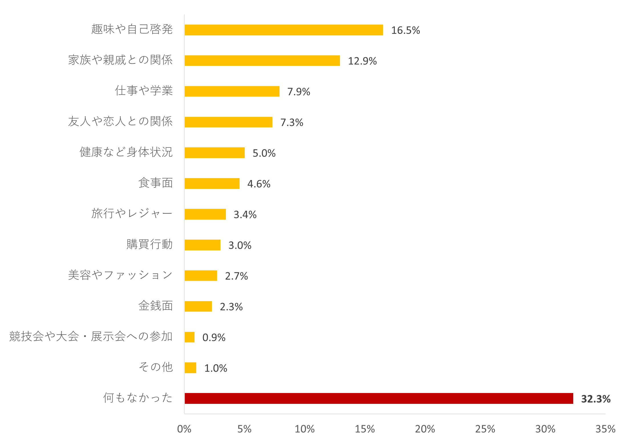 今年1年間で最も充実していたことを聞いたところ、「何もなかった」が32.3%で最も高く、次いで、「趣味や自己啓発」が16.5%、「家族や親戚との関係」が12.9%と上位に挙がりました。コロナ禍で自分自身のことを充実させた人が多かった他、おうち時間の充実によって、家族との時間が増えたことが影響したものとみられます。