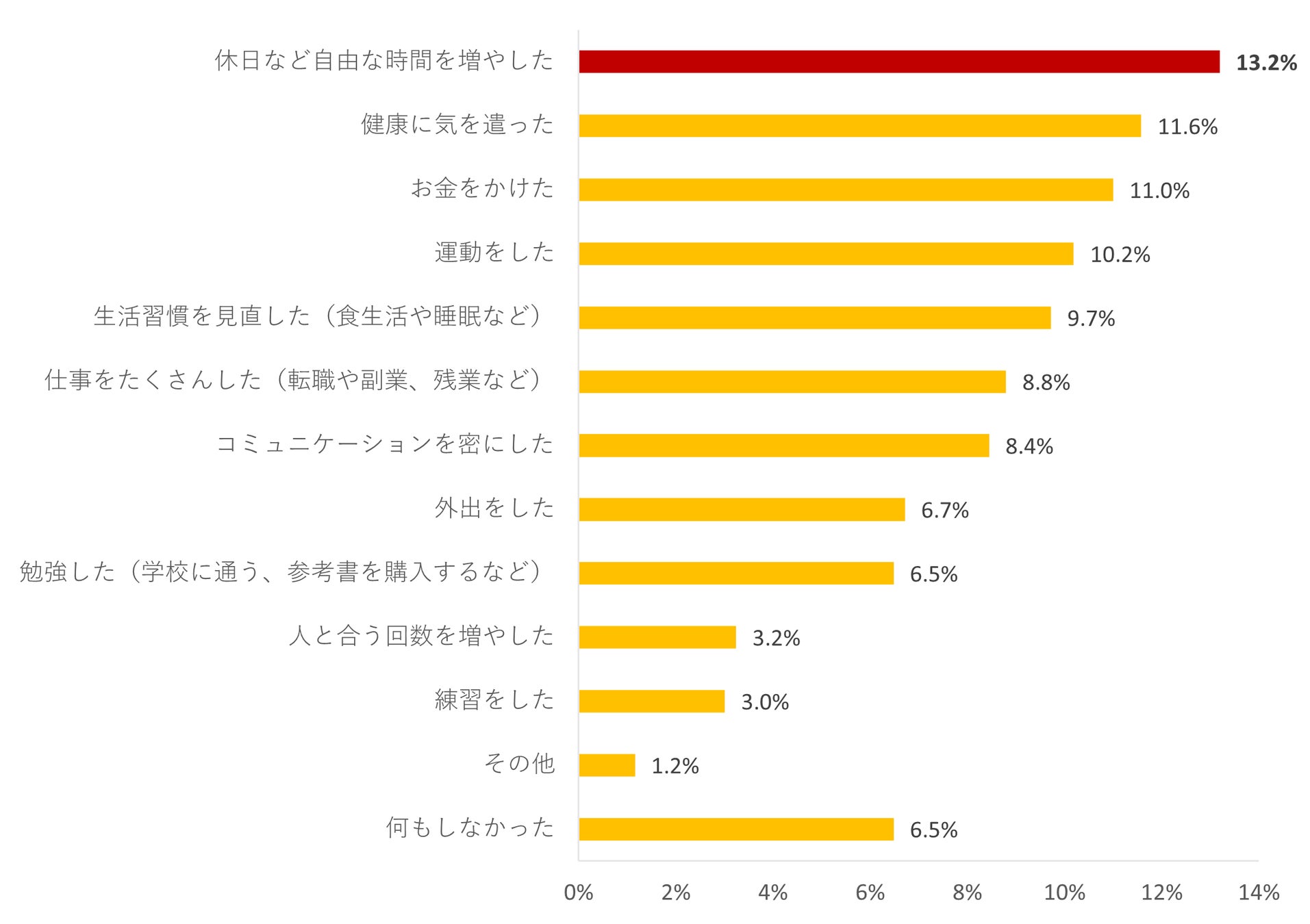 「今年1年間で最も充実していたこと」のために何をしたかを聞くと、「休日など自由な時間を増やした」(13.2%)、「健康に気を遣った」(11.6%)、「お金をかけた」(11.0%)の順となりました。一方、回答数が少なかったのは「コミュニケーションを密にした」(8.4%)、「外出した」(6.7%)、「人と会う回数を増やした」(3.2%)でした。自由な時間や健康、自分への投資など、自分自身の充実を図ったという人の充実度が高く、逆にコロナ禍の影響から、コミュニケーションや外出、人との接触機会を充実していたことに挙げる人は少ない結果となりました。