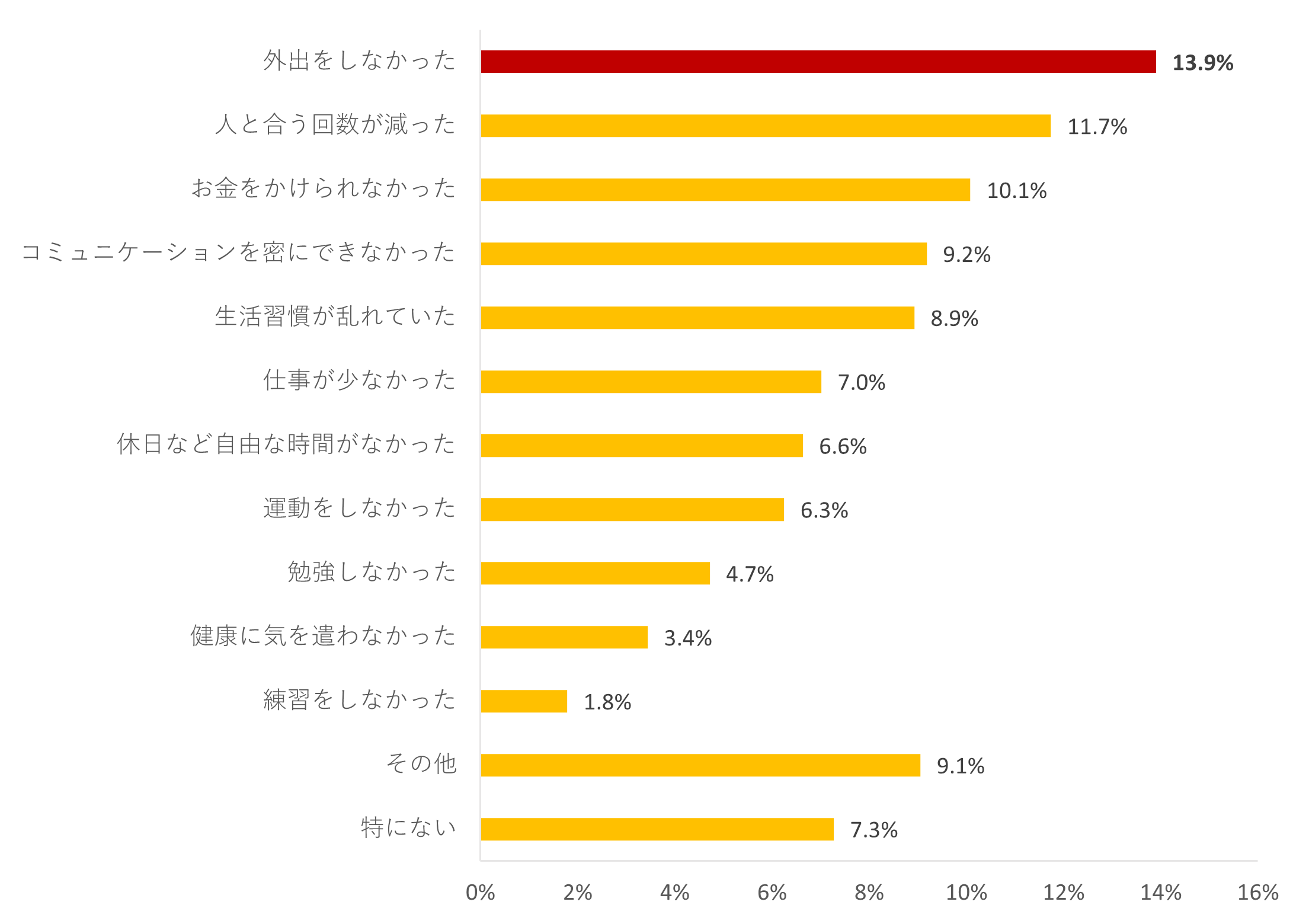 「最も充実していなかったこと」の理由について聞くと、最も高かったのは「外出をしなかった」で13.9%となりました。また、「人と会う回数が減った」(11.7%)、「コミュニケーションを密にできなかった」(9.2%)ことを充実しなかった理由に挙げる人も多くいました。新型コロナウイルス感染症拡大によって行動が制限されてしまったことに加えて、感染防止の観点から人との接触を避ける必要があったことが、生活の充実につながらなかったものと推察されます。