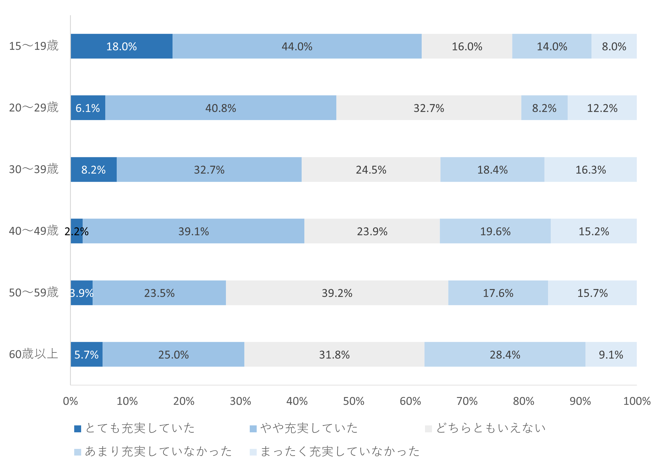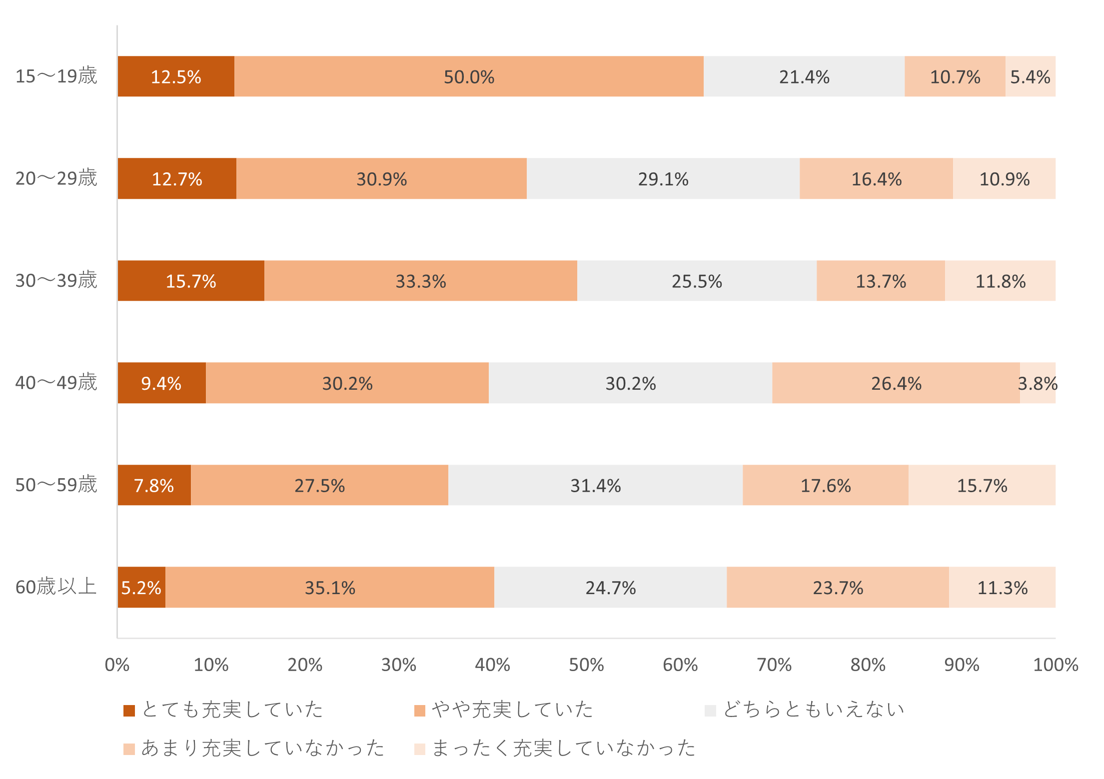 女性の充実度についても年齢が高まるにつれて、「充実していた」(「とても充実していた」+「やや充実していた」)が少なく、「充実していなかった」(「あまり充実していなかった」+「まったく充実していなかった」)が高い傾向にあるものの、「充実していた」と回答した人が男性に比べて多いことがわかりました。