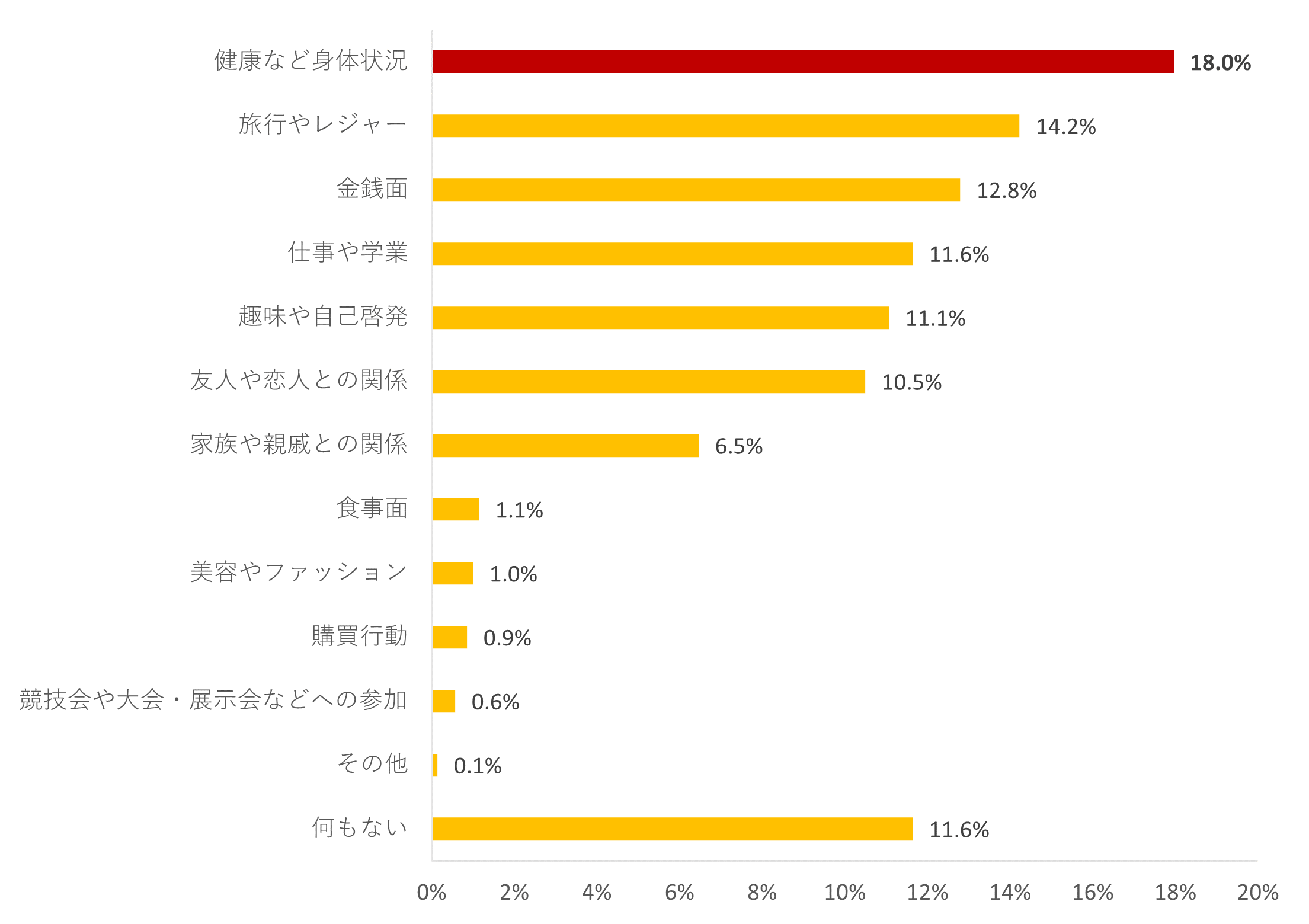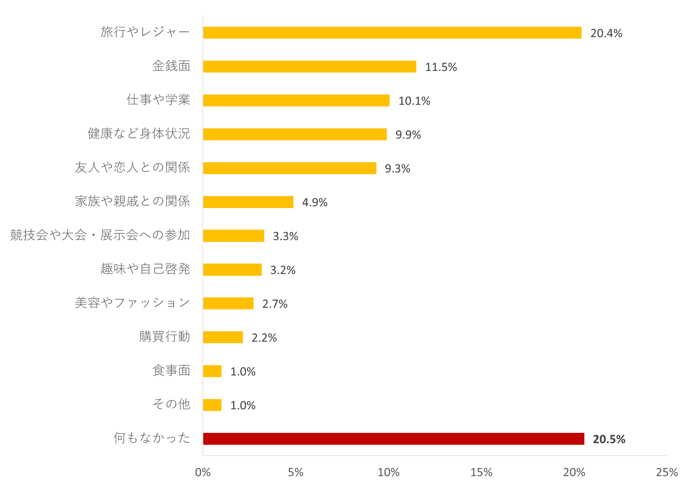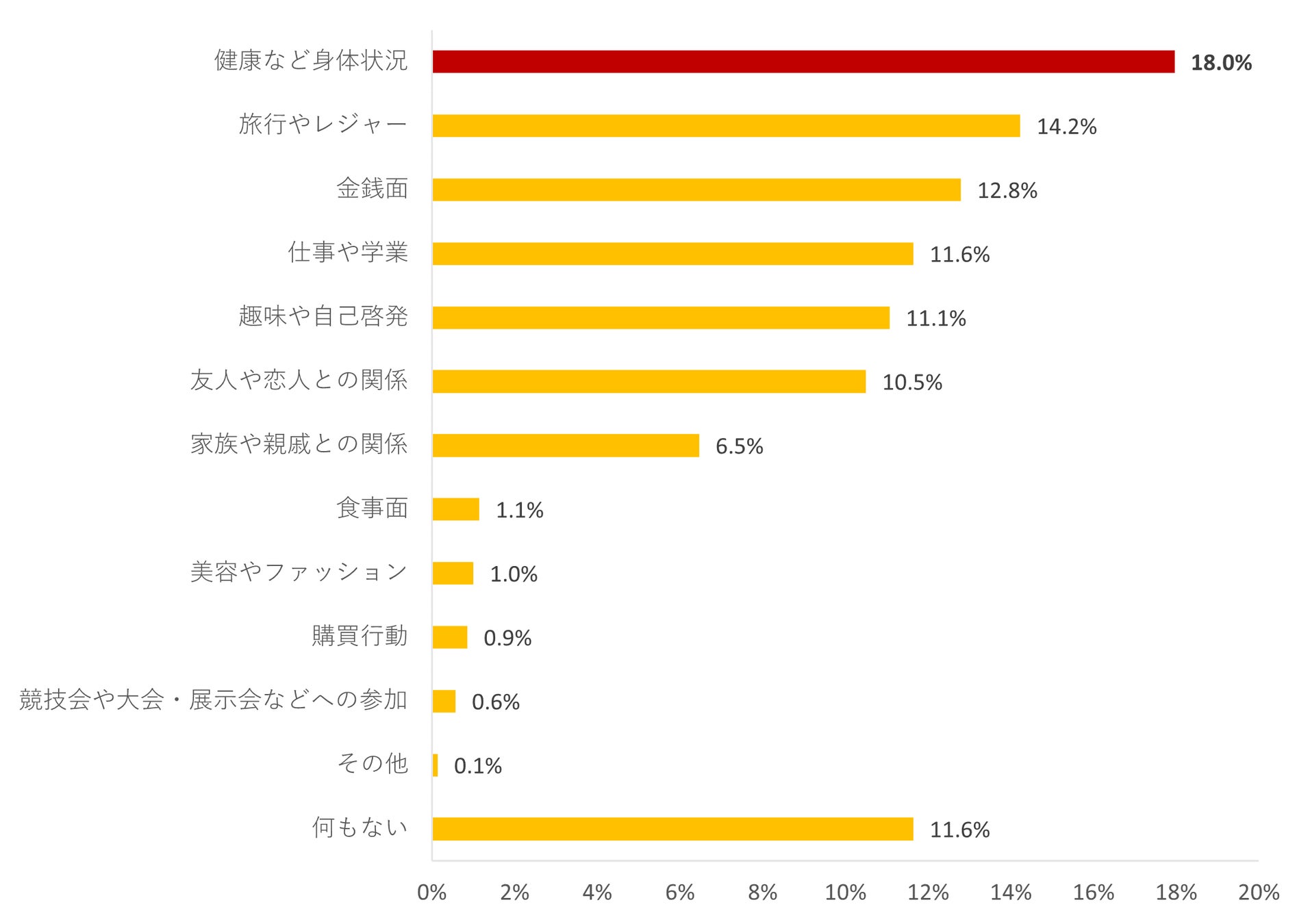 今年1年間で最も充実していなかったことについては、「何もなかった」が20.5%で最も高く、次いで、「旅行やレジャー」(20.4%)、「金銭面」(11.5%)、「仕事や学業」(10.1%)の順となりました。緊急事態宣言の発出やまん延防止措置等による外出自粛、リモートワークの推奨、飲食業やレジャー産業等での営業時間の短縮要請の影響が生活の充実度にも反映される結果となりました。