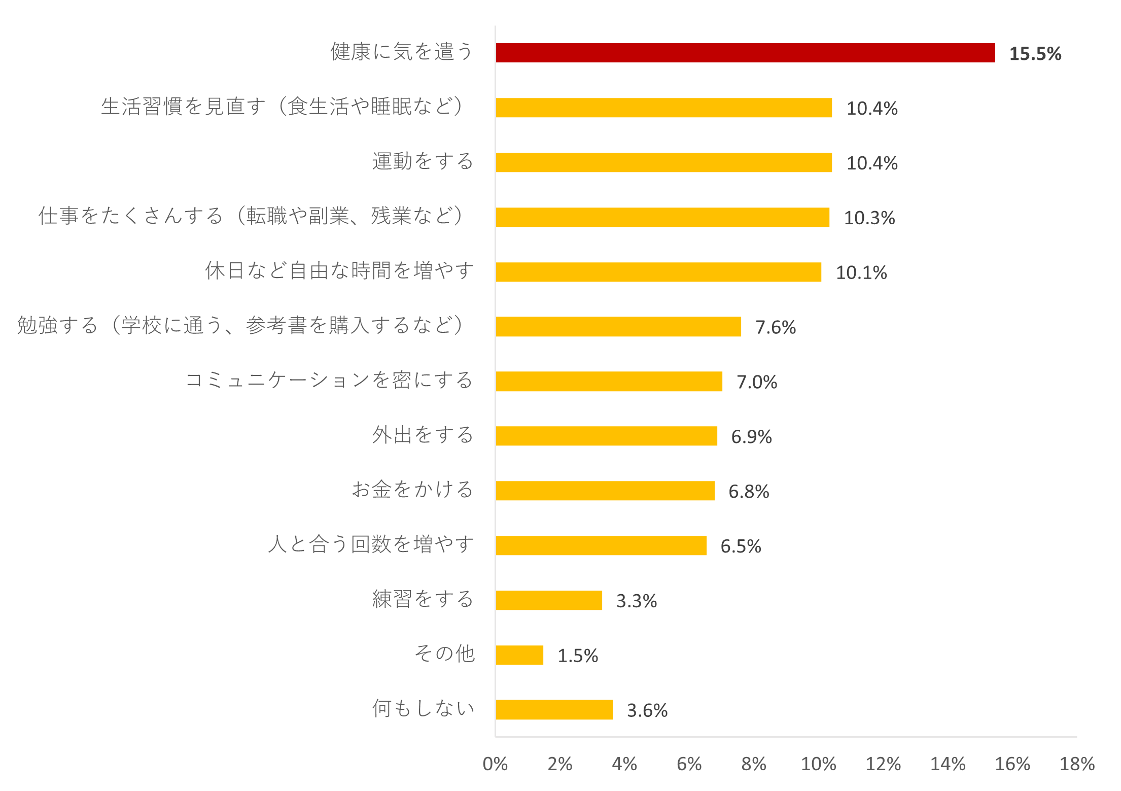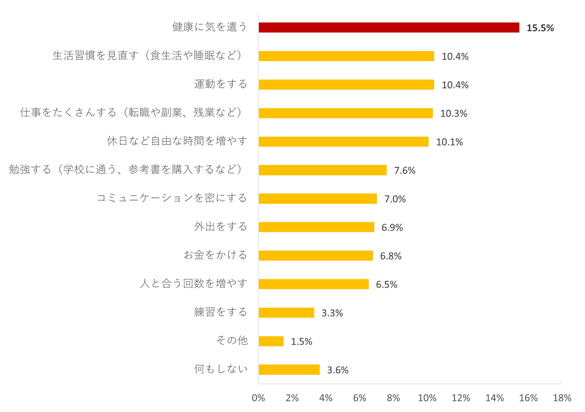 「来年最も充実させたいこと」のためにすることを聞いてみると、「健康に気を遣う」が15.5%で最多となり、次に10.4%で「生活習慣を見直す(食生活や睡眠など)」、「運動をする」が並びました。自分自身の健康に気を遣うだけでなく、健康でいるために、生活習慣の見直しや運動などを積極的に行って、生活の充実度を図っていきたい考えがうかがえる結果となりました。