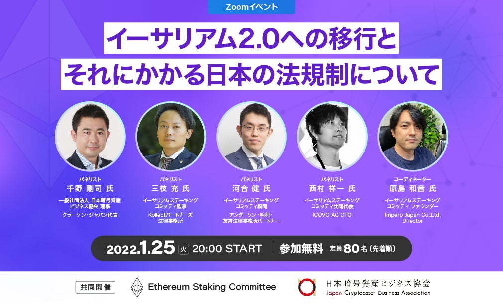 イーサリアム財団がスポンサーを務めるイーサリアムステーキングコミッティーがステーキングに関する ZOOMイベント「イーサリアム2.0への 移行とそれにかかる日本の法規制について」を開催