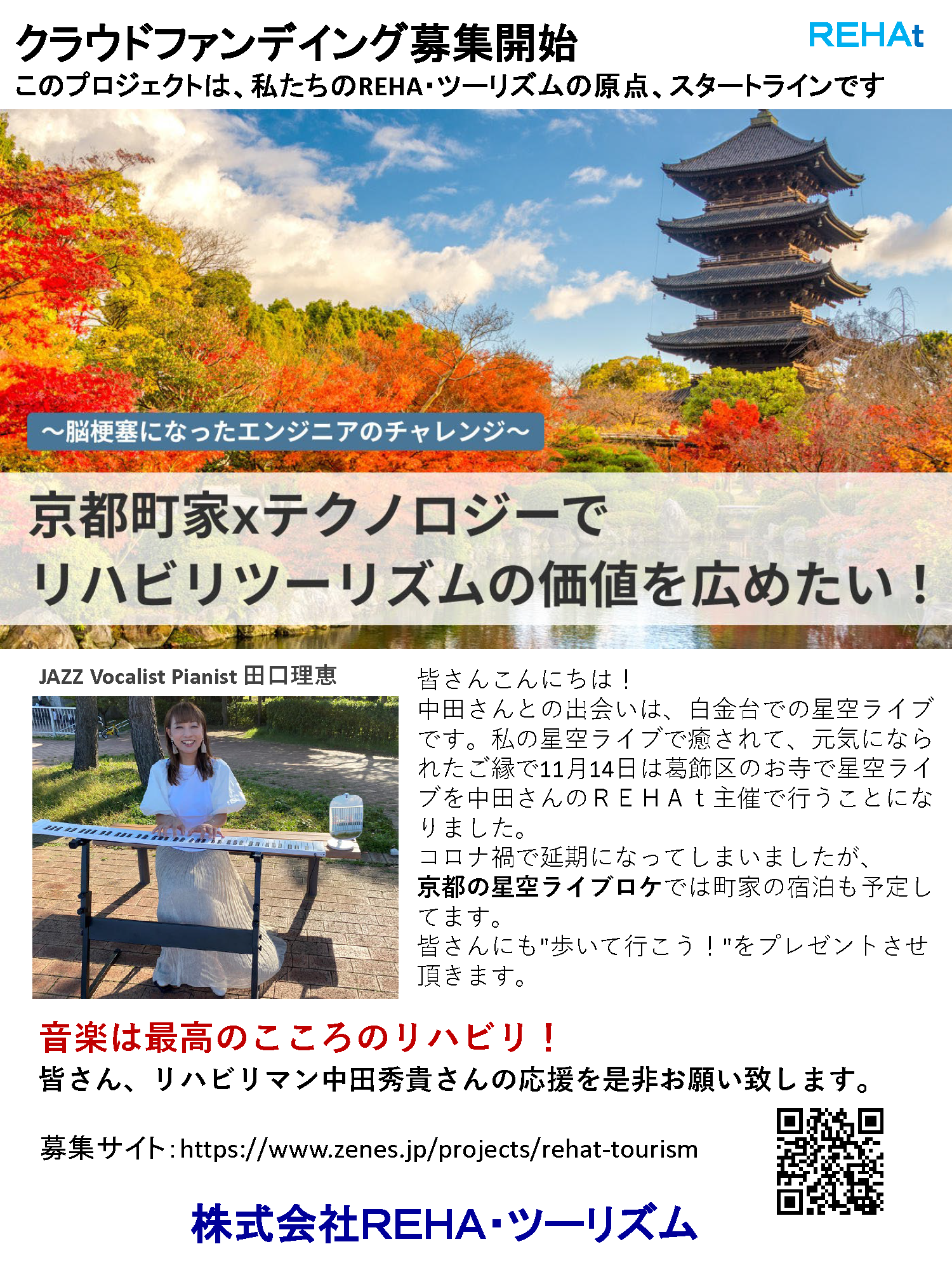 ”京都町家xテクノロジーでリハビリツーリズムの価値を広めたい! ”プロジェクトですが、皆さまの温かい応援のおかげでご支援額は目標金額の80%に到達しております。残り45日、より一層頑張ってまいりますので、引き続き応援をよろしくお願いいたします。