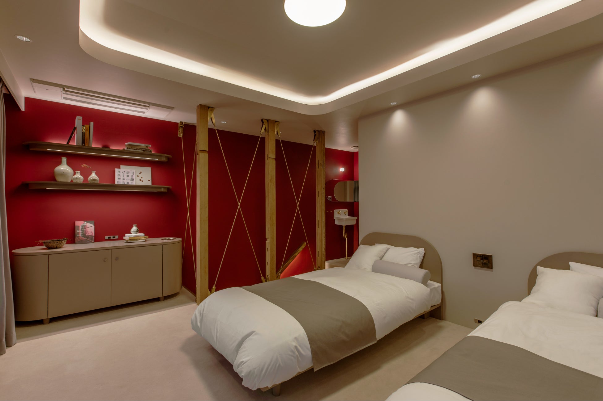 空き家だった建物の外壁はそのままに、外部との大きなギャップを生む内装設計、置かれる家具も全てオリジナルデザインで唯一無二の空間をご用意いたしました。合宿でありながら、個々の空間も確保され、利用者は集団行動も個別行動も可能な導線となっております。