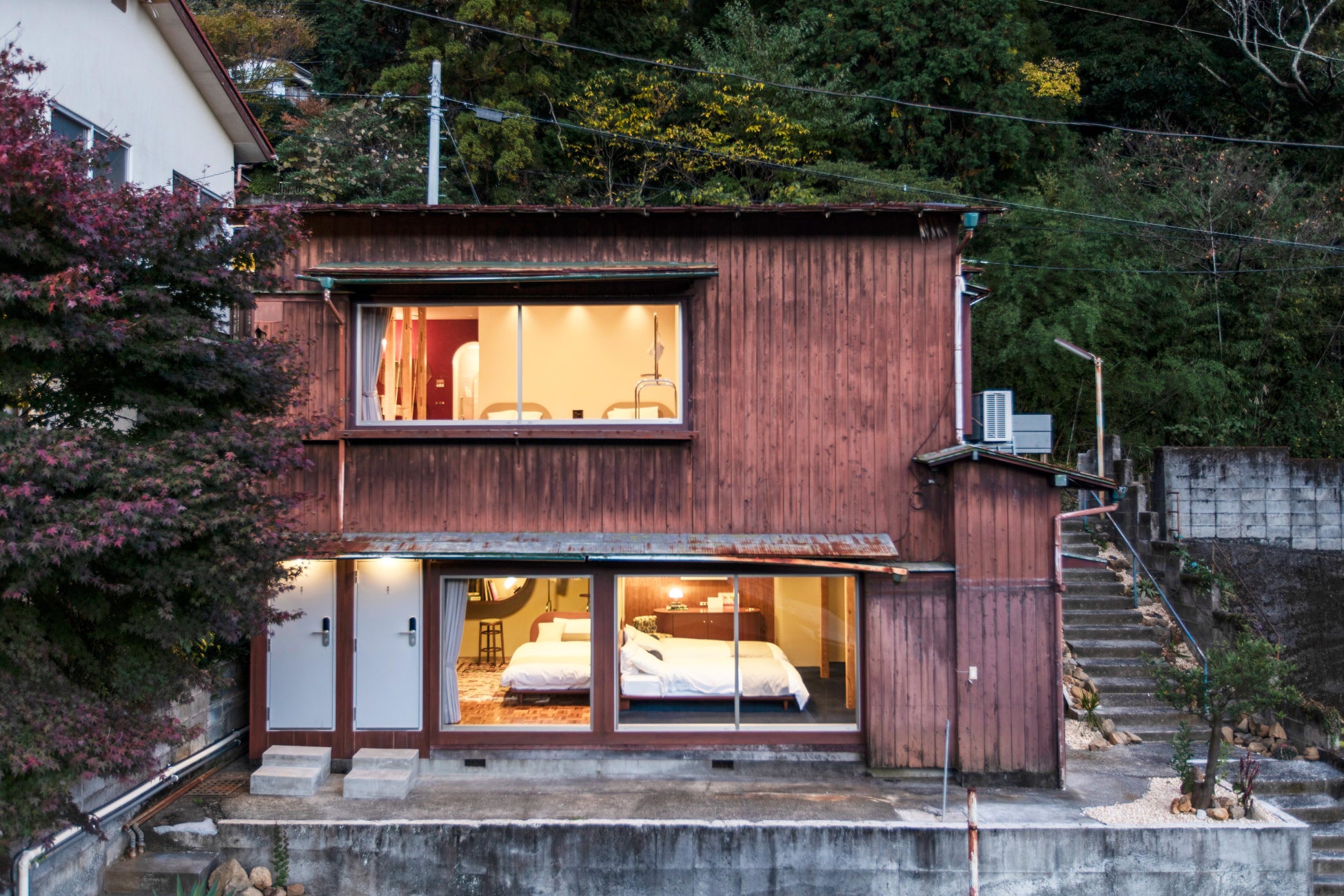 敷地内は、長らく空き家だった家屋をリノベーションした2棟からなり、喫茶店を併設した客室棟と温泉付きの作業棟となっています。全体設計を手掛けたのはデザイナー近藤尚(naoshi kondo)。作業棟となる建物はモルタルで半分埋まり、その大胆な意匠はデザイナーとして不合理さを形にする近藤の作品となっています。利用者の創造性へ接続することを目的として形づくられました。