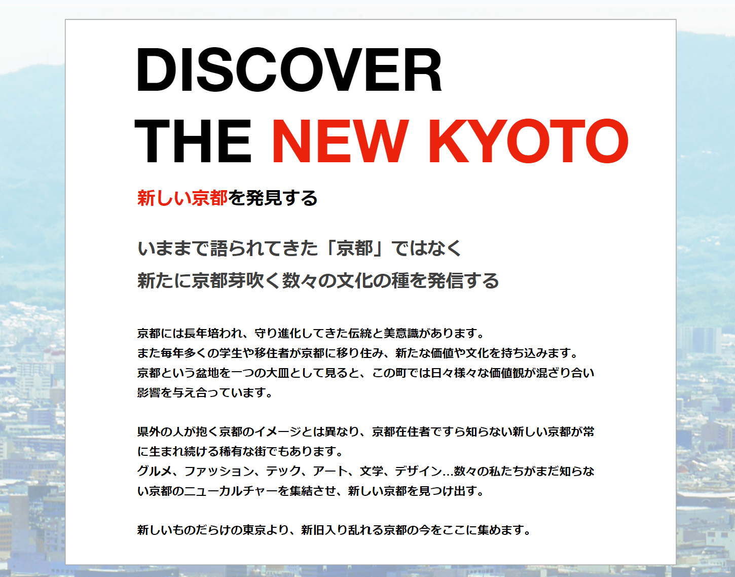 コメント:私たちの住む京都には無数の魅力的な文化が存在します。他の都市に比べ小さな街の中で高い密度で文化が存在するが京都の魅力です。それ故に実はすぐ隣で息づいていた文化を見逃していたりと、長年住んでいてもなお今だに新しい京都の一面を見ることができる稀有な街です。京都が育んだ伝統工芸の世界では日々変化することで長い歴史を紡いできたといいます。同様にまだ芽吹いたばかりの新しい文化も日々変化し、成長しつづけている文化が息づく都市・京都の今を多くの人に届けることができればと思っています。