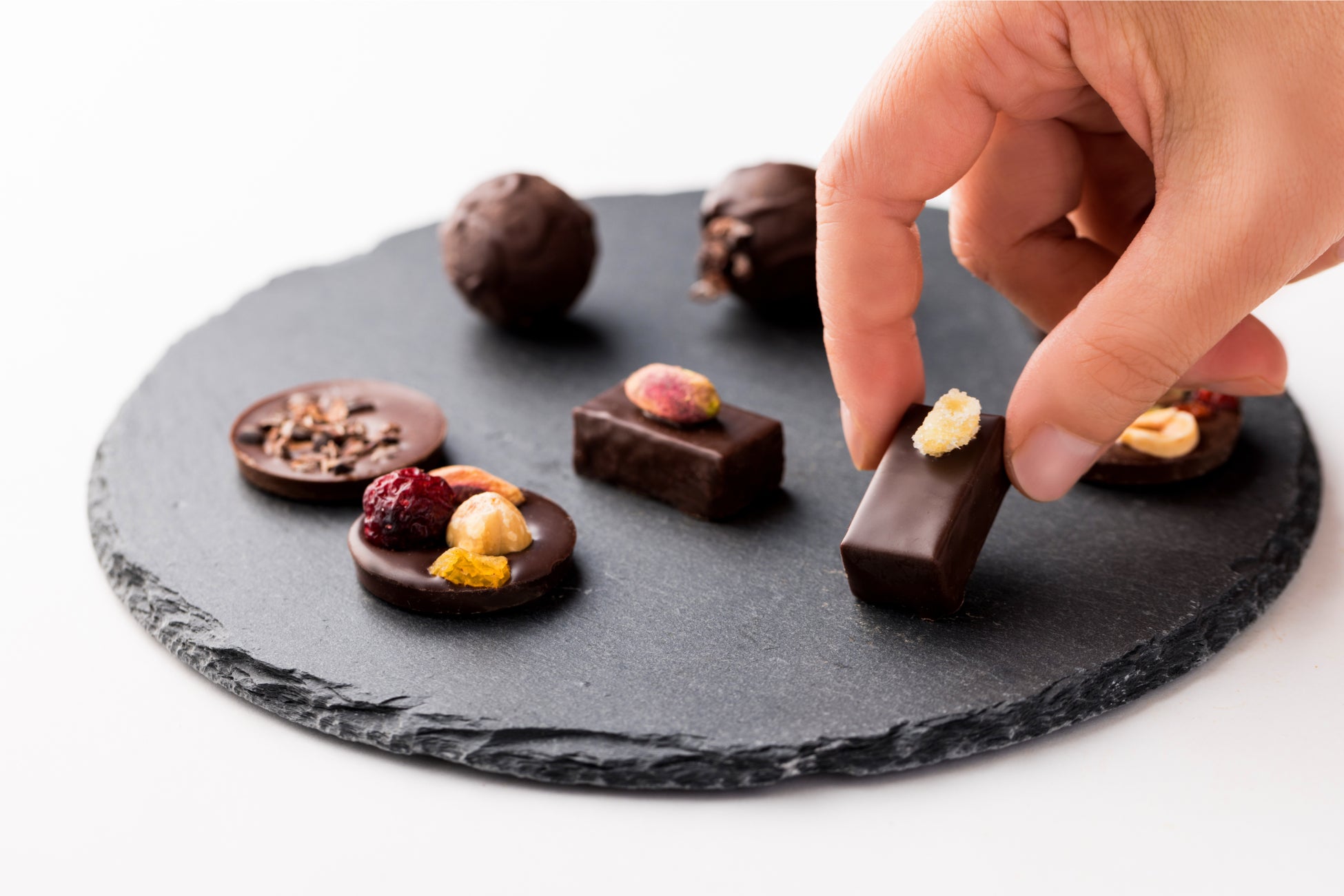 カカオ、ドライフルーツ、ナッツ、スパイスなどの素材を活かし、五味(⽢み、塩味、酸味、苦味、旨み)を刺激し、変化を与えるチョコレートは気品に溢れた奥深い味わいが特徴です。