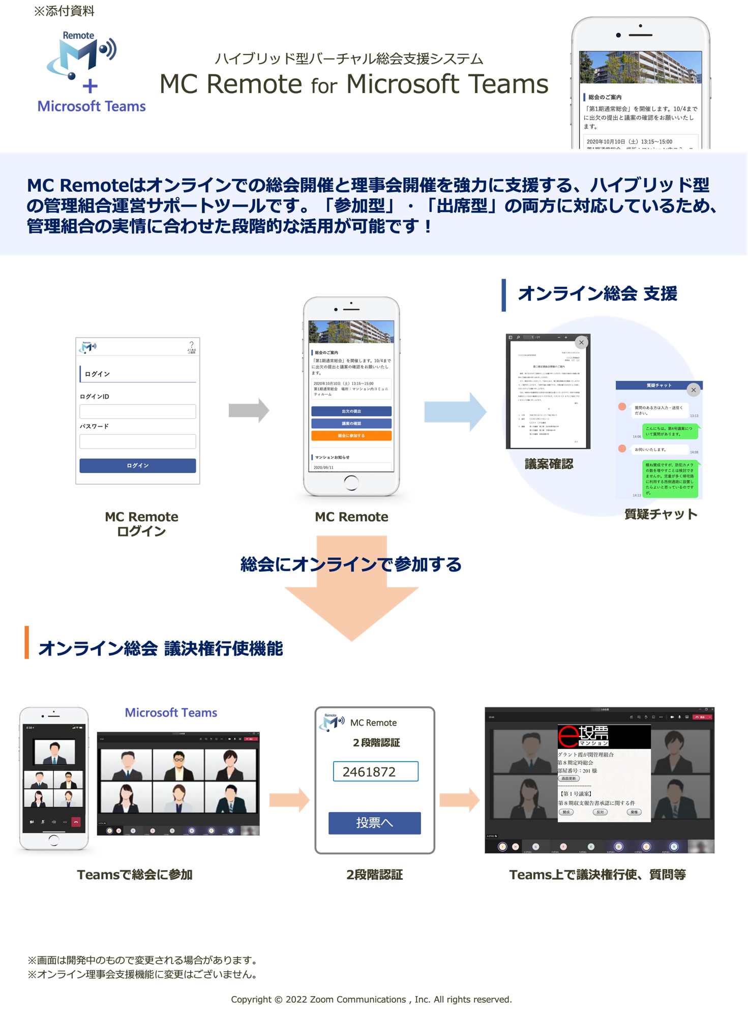 株式会社ズーム・コミュニケーションズ*1(本社:東京都中野区、代表取締役社長:今泉 浩二)は、2020年10月に発表したハイブリッド型オンライン総会支援システム「MC Remote」(エムシーリモート)の追加機能として、マイクロソフトが提供するMicrosoft Teams*2と連携してマンションにおけるオンライン総会を支援するアプリケーションを開発したと発表しました。