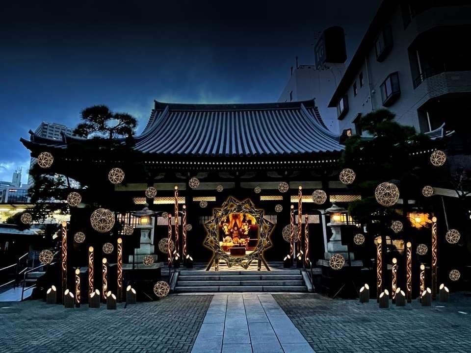 「竹あかり」という新しい日本の工芸アートを見ながらの外気浴。自然を借景した寺のライティングにより忙しい日々を忘れ、幻想的な「ととのい」に。