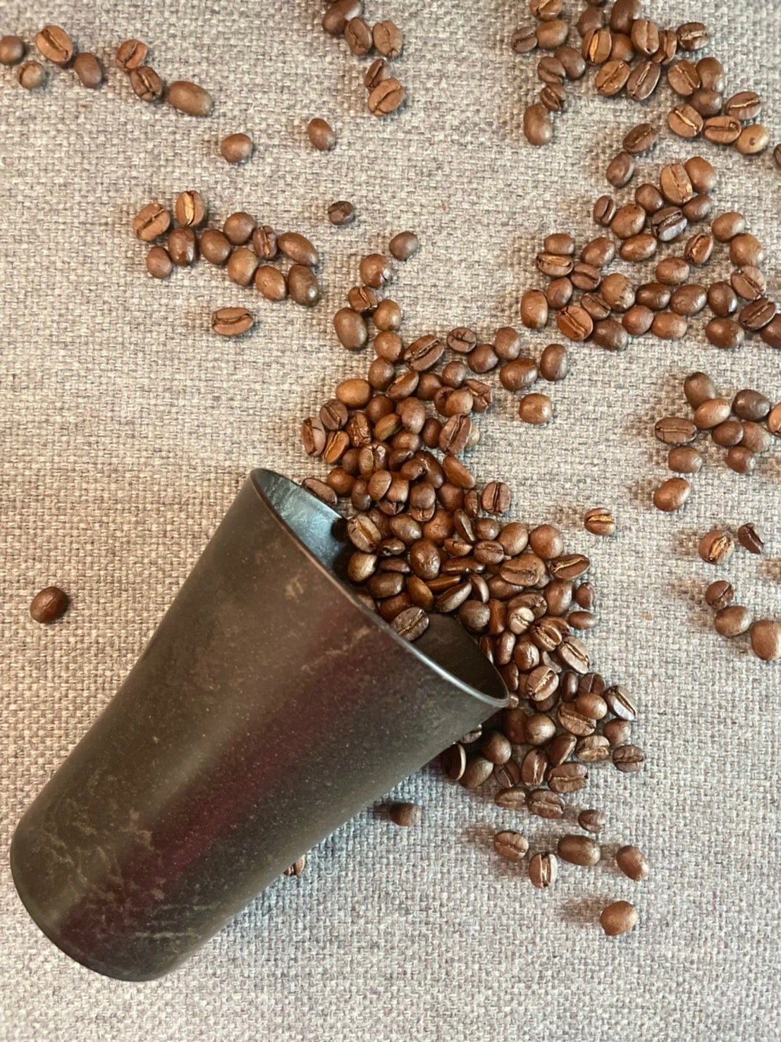 珈琲として飲用できなくなった廃棄となるコーヒー豆を再利用したコーヒー豆カップ。コーヒー豆28%、ヒノキ27%を使用することでプラスチックの使用を50%以下に抑えたタンブラーです。コーヒーとヒノキの香ばしい香りが感じられます。
