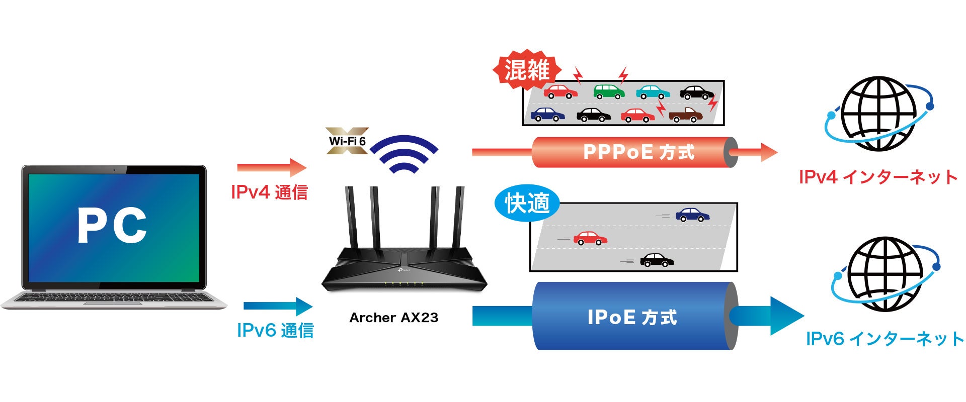 「Archer AX23」は、IPv6 IPoEによる快適なインターネット接続と、Wi-Fi 6テクノロジーによる高速データ通信を提供します。