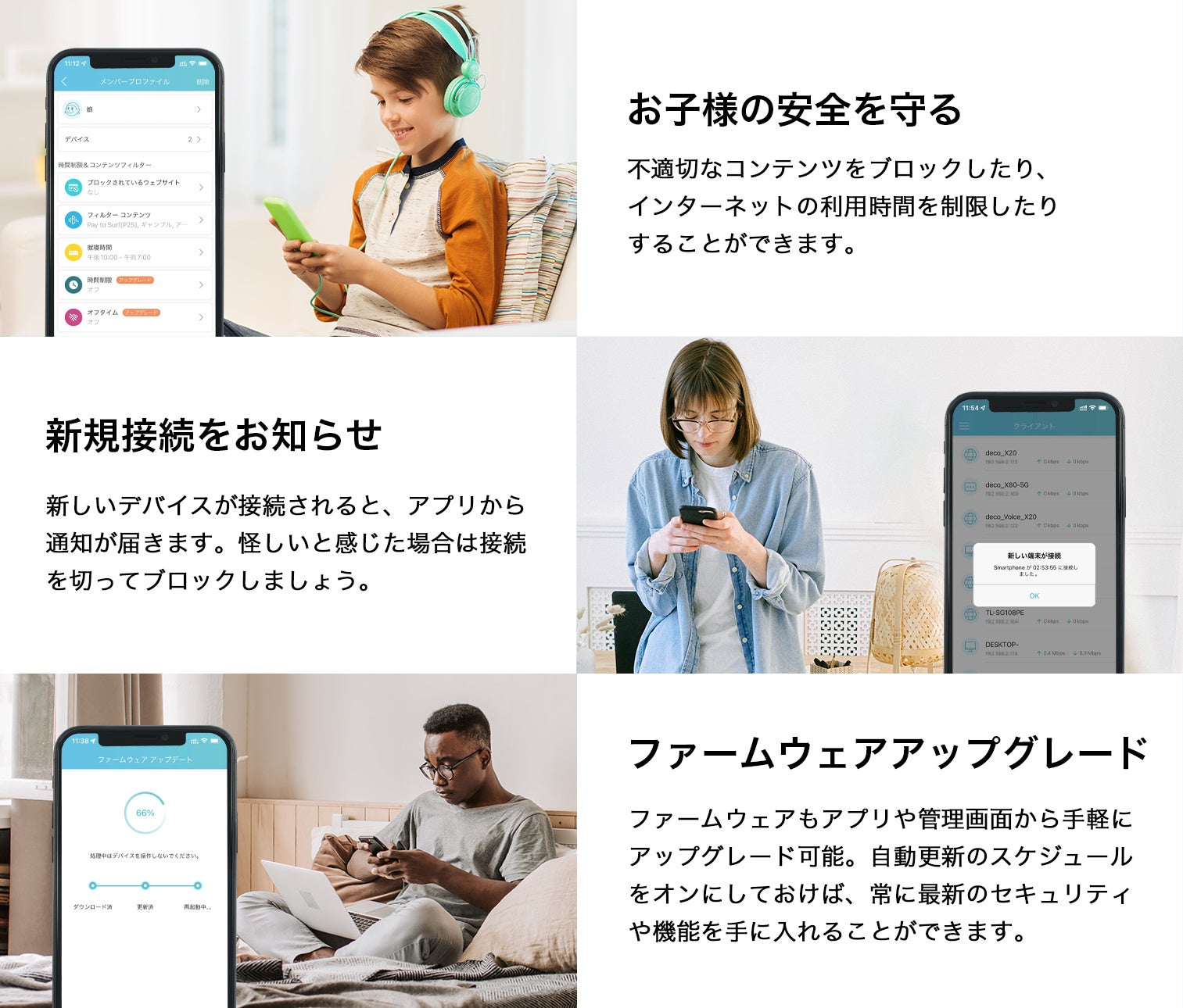 保護者による制限機能では、端末ごとに不適切なコンテンツをブロックしたり、1日のインターネット時間を制限したりすることができます。また、ゲストネットワーク機能を使用すれば、ネットワークを安全に保ったままゲストにインターネット接続を提供できます。