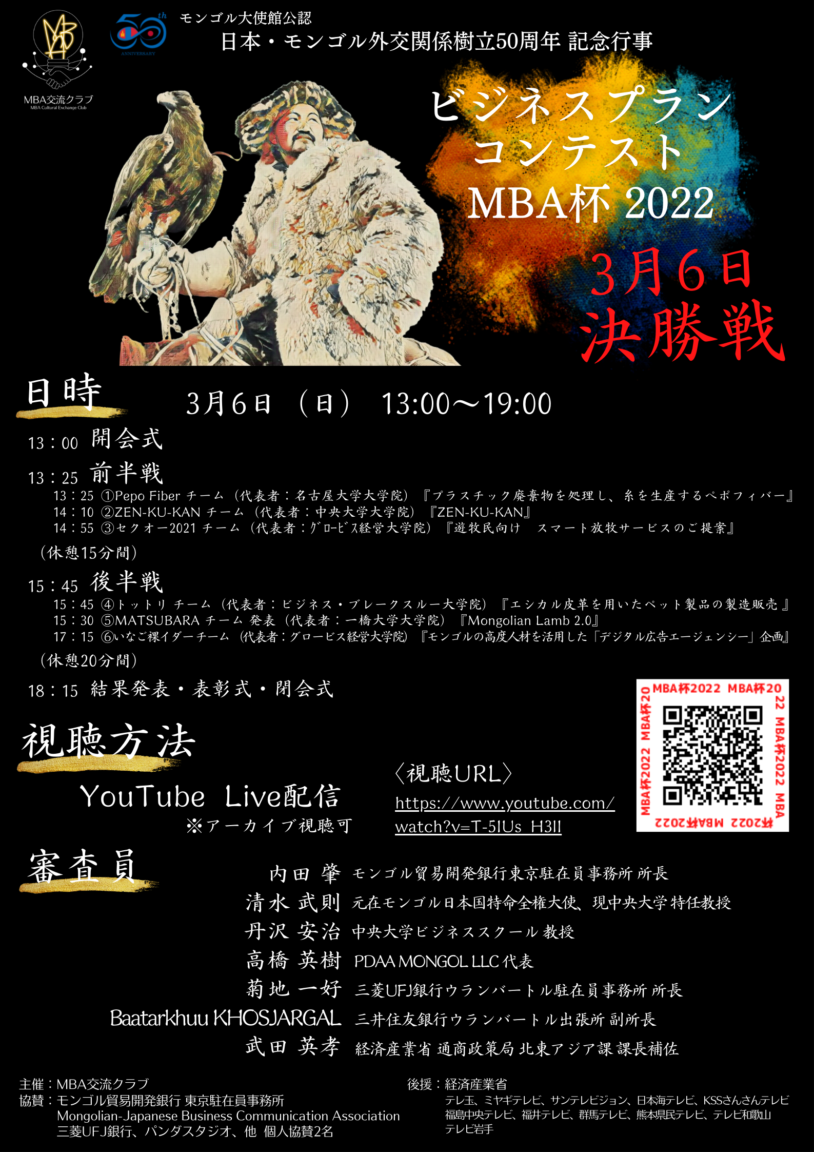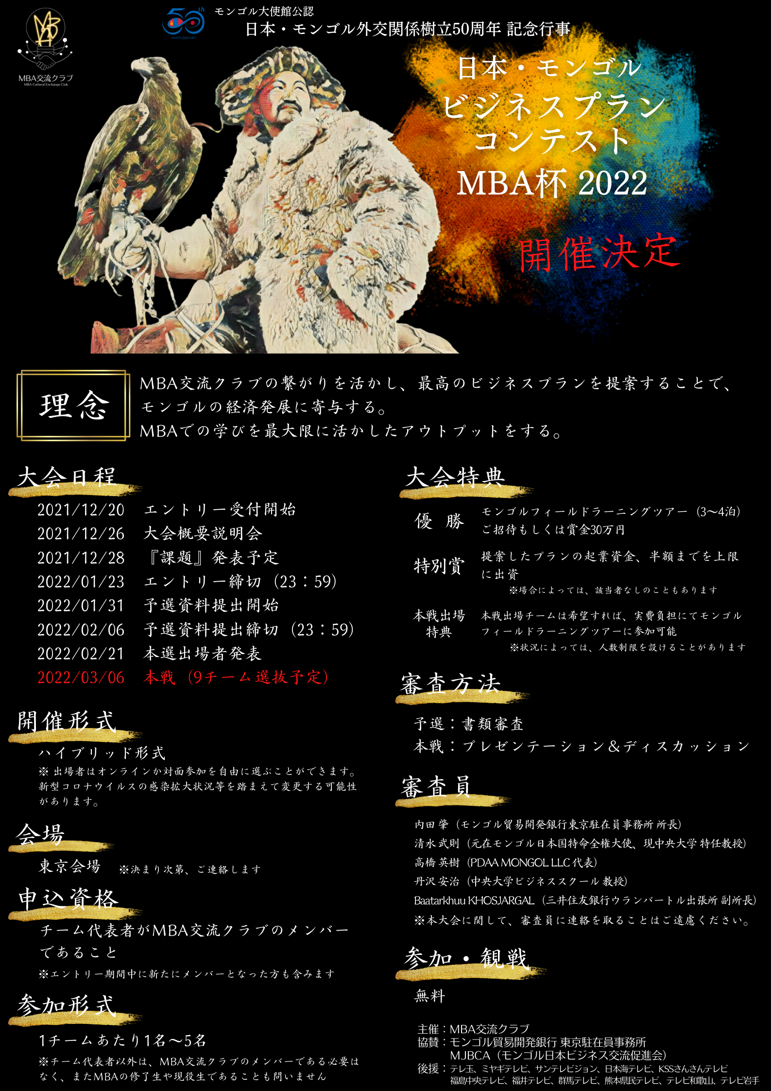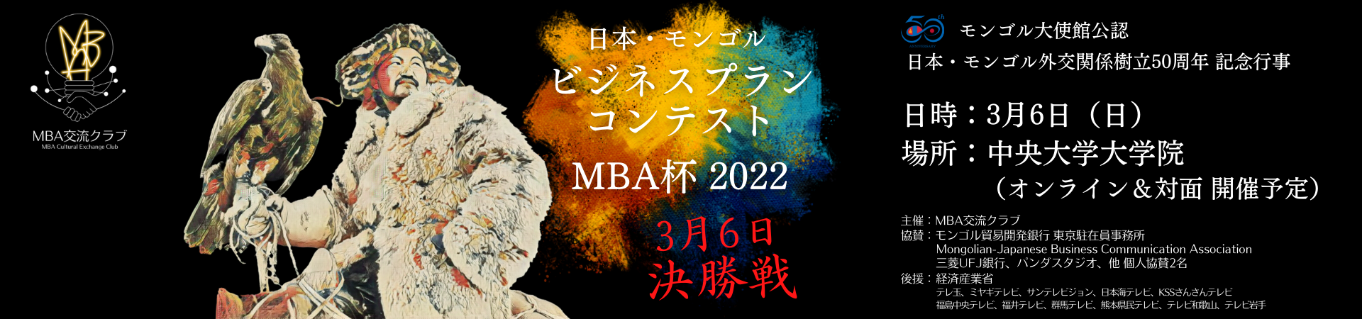 協賛:モンゴル貿易開発銀行 東京駐在員事務所、MJBCA(モンゴル日本ビジネス交流促進会)、三菱UFJ銀行、パンダスタジオ、他 個人協賛(2名)