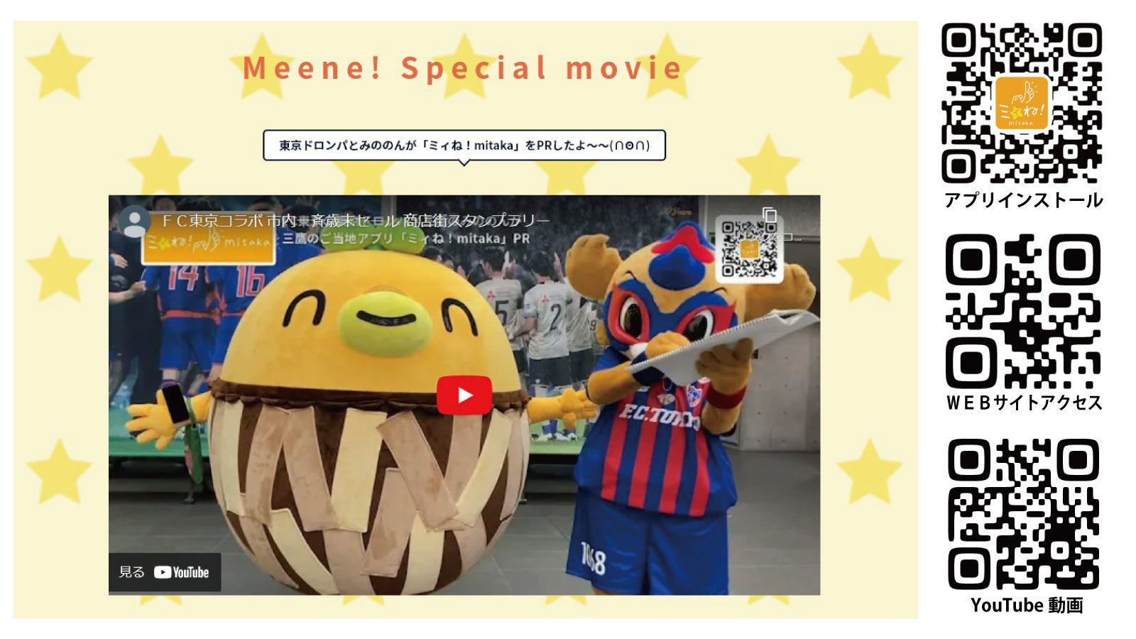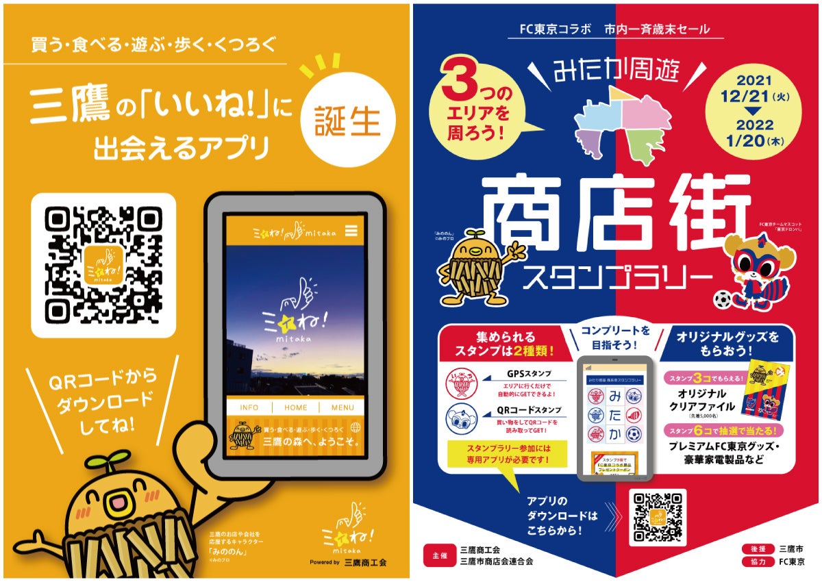 『ミィね!mitaka』は、利用者のスマートフォンのGPSやビーコン機能を利用し【その時・その場】に合った情報やサービスを【その時・その場】で提供することを特徴にしたジオメディアツールです。市内全域で利用可能にすると共に、デジタルスタンプラリーといったイベントツールとしても機能させることにより、市内商店街における集客・回遊性の向上を図り、販売機会を創出することを目的に導入し、現在内22商店会・全529店舗の情報を多言語で配信すると共に、「FC東京コラボ 市内一斉歳末セール みたか周遊 商店街スタンプラリー」を開催(~2022年1月20日)しております。