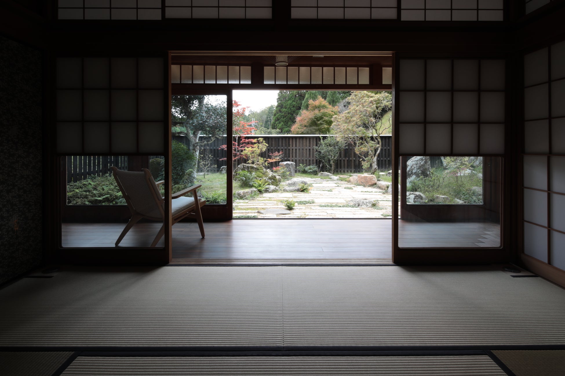 スイートルーム「真秀」は、古民家の風情と現代的な快適さを兼ね備えた贅沢な空間です。65㎡の広々とした客室は美しい木目と落ち着いた色調でまとめられ、地元の畳屋であるオーナーのこだわりから、貴重な畳を使用。広大な客室専用のお庭では、四季折々の自然を楽しめます。