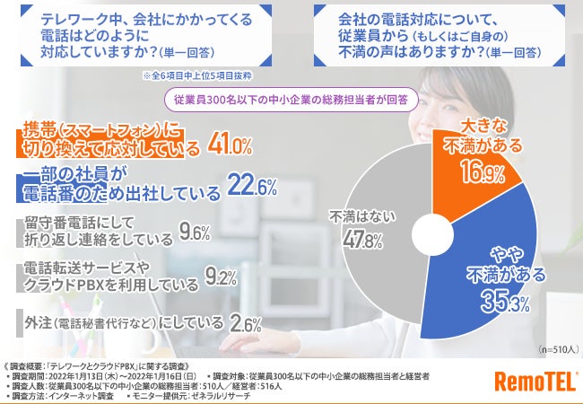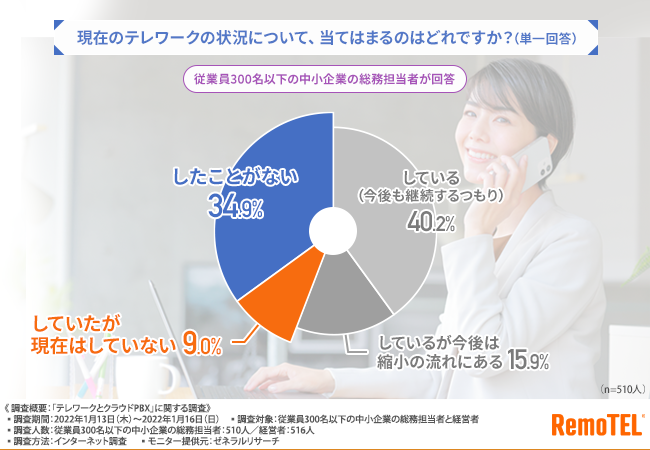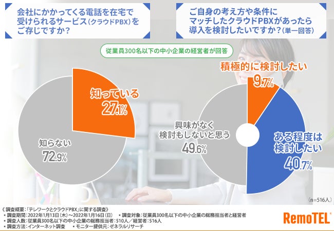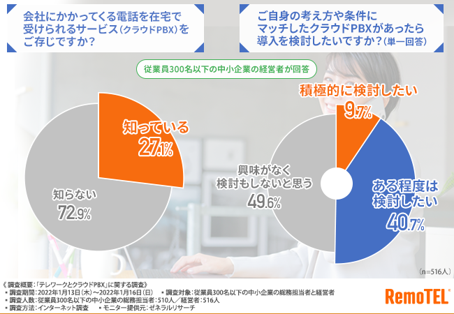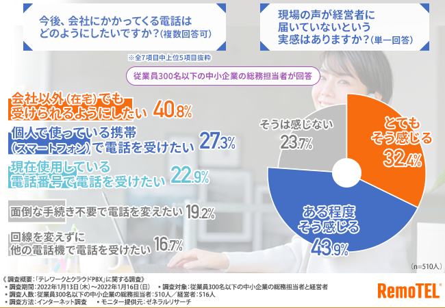 従業員300名以下の中小企業の総務担当者と経営者を対象に、「テレワークとクラウドPBX」に関する調査を実施しました。