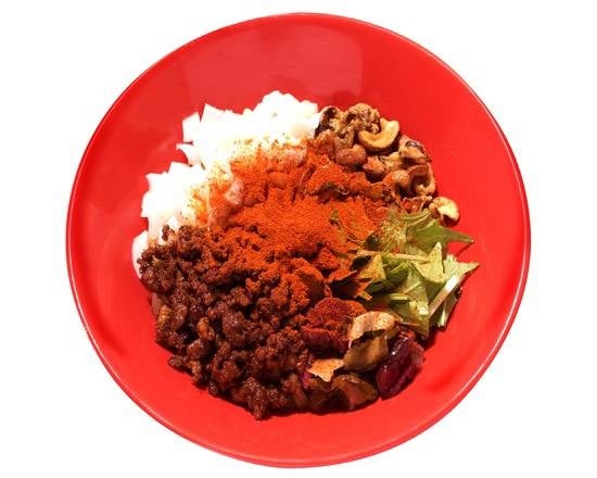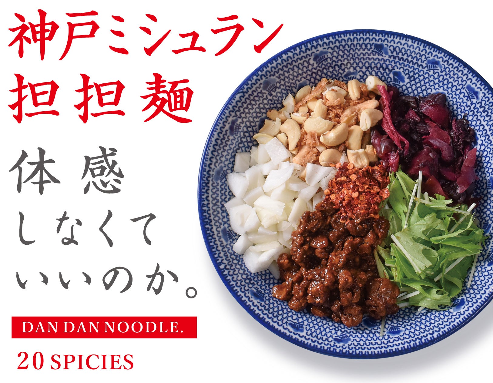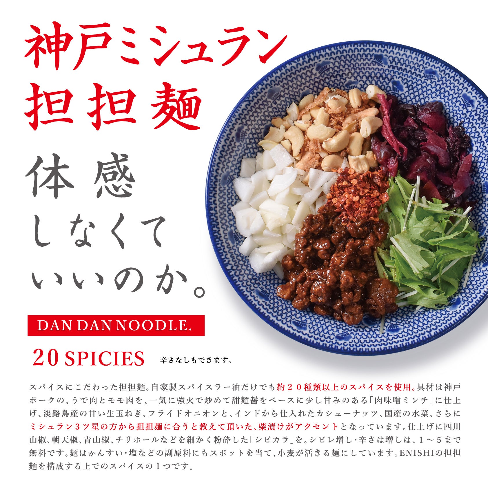 辛さとシビレ、スパイスの効いた刺激的で中毒性のある担々麺。スパイス好きにはたまらない一杯。物足りない上級者は辛さ、シビレ、増しもできます。約20種類のスパイスを使った辣油」をベースにさらに32種類の食材とスパイスを0.01g単位で配合させたタレに、全粒粉・挽きぐるみ粉などを合わせた平うち麺を混ぜ合わせました。トッピングには肉ミンチ神戸ポークとインドから仕入れるカシューナッツと甘みあるある淡路島さんの玉ねぎを一気に底からかき混ぜてお召し上がり下さい。
