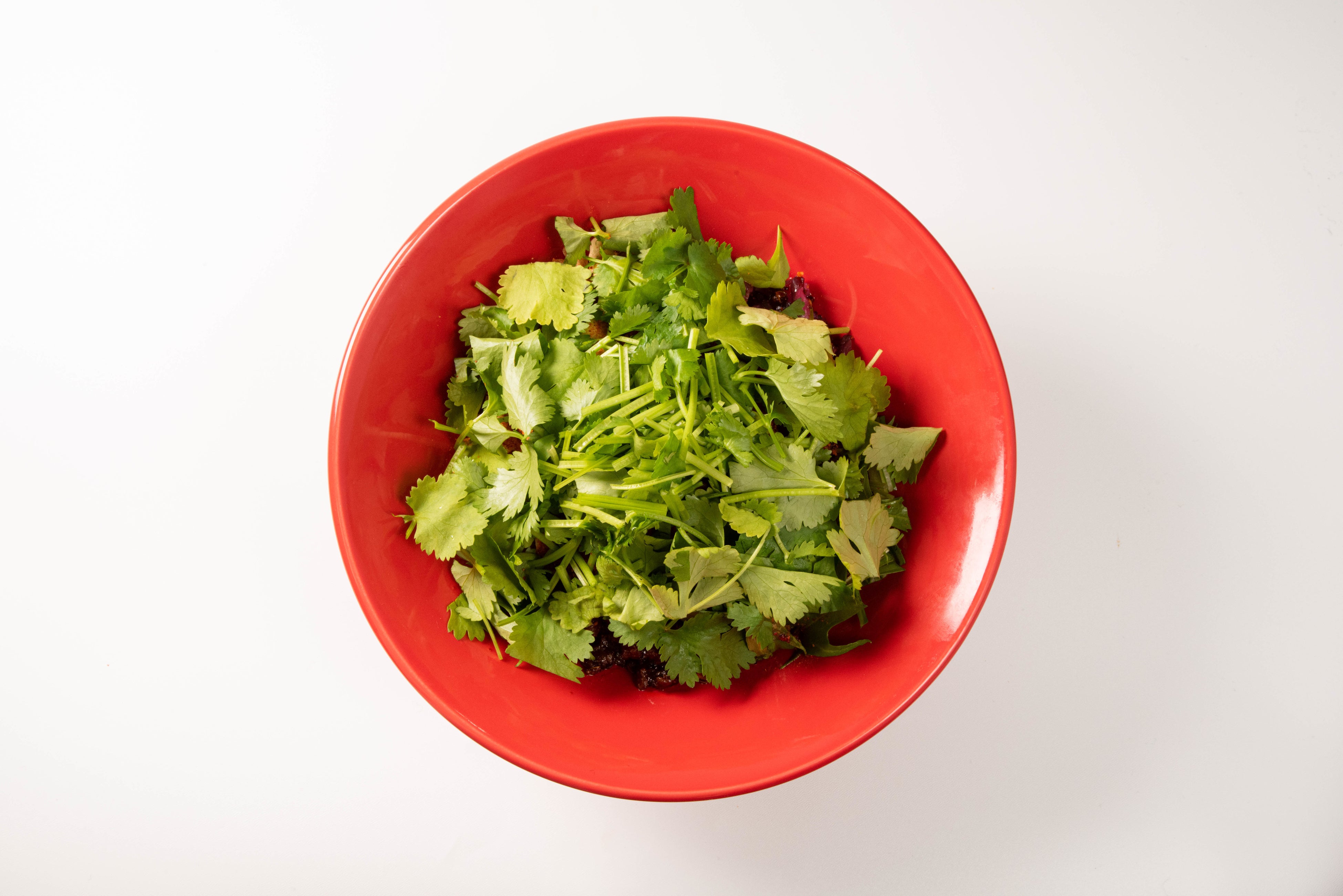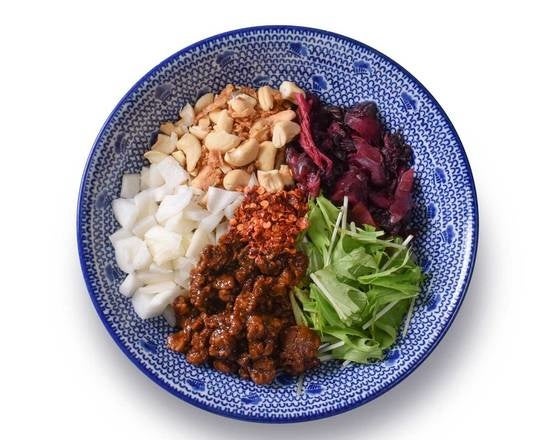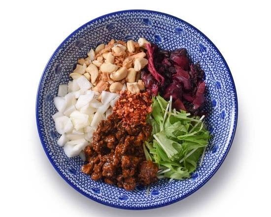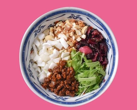 上から見たらパクチーしかない!!!中辛のタレをベースに毎朝作る芝麻醤(チーマージャン)を聞かせた胡麻感が濃厚な担担麺。若者に人気です。約20種類のスパイスを使った辣油」をベースにさらに32種類の食材とスパイスを0.01g単位で配合させたタレに、全粒粉・挽きぐるみ粉などを合わせた平うち麺を混ぜ合わせました。トッピングには肉ミンチ神戸ポークとインドから仕入れるカシューナッツと甘みあるある淡路島さんの玉ねぎを底からかき混ぜてお召し上がり下さい。