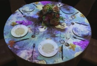 バンケットの凹凸に合わせて映像コンテンツを作成します。壁面3~4面に映像が投影される演出は室内ならでは。壁面1面から導入可能。