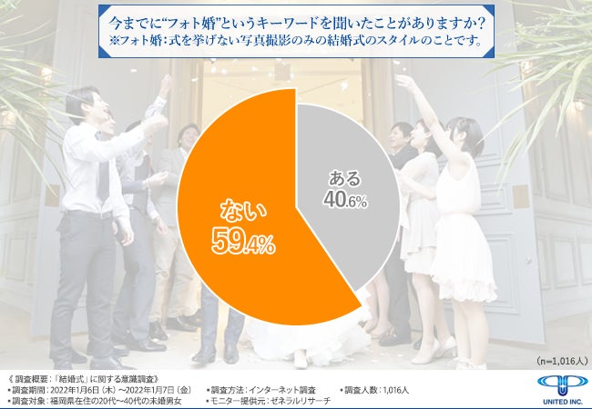 そこで、「今までに”フォト婚”というキーワードを聞いたことがありますか?※フォト婚:式を挙げない写真撮影のみの結婚式のスタイルのことです。」と質問したところ、6割近くの方が『ない(59.4%)』と回答しました。