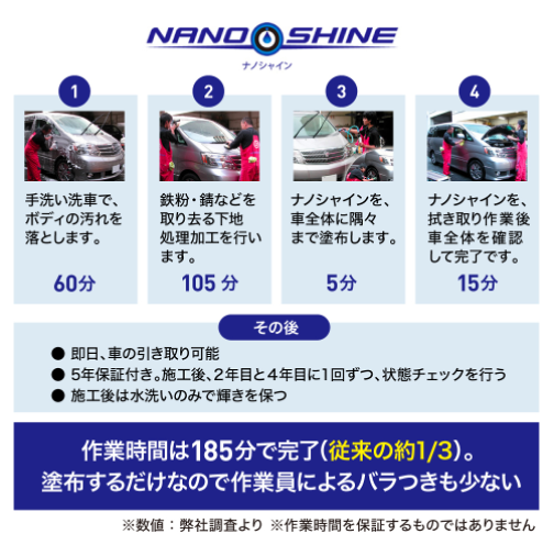 一般的なガラスコーティングの被膜は100ミクロン~300ミクロン(1000分の1ミリ)なのに比べて、弊社のナノガラスコーティングは20〜60ナノメートル(100万分の1ミリ)程度です。だからこそ、車体の動く部分に必要だったマスキング等の作業も不要で、車体丸ごとに、そのままガラスコーティングを施すことが可能です。極めて薄い被膜だからこそ乾きも速く、作業時間は従来のガラスコーティングの約1/3に短縮できます。さらに特徴的なのは、化学薬品が一切含まれない環境に優しい技術であることです。従来法で必要だった硬化剤は不要で、シリカ成分と水道水しか使用しません。実際に大学との共同研究により、弊社製品に使用する水が、水道法水質基準に適合していることが立証されております。