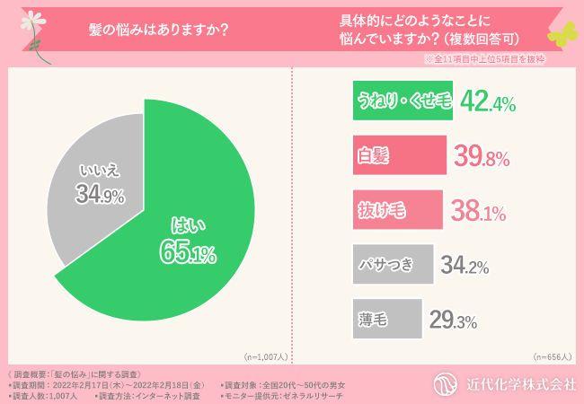 そこで今回、「ヘアケア工房」(https://www.kindaikagaku.com/)を運営する近代化学株式会社は、全国20代~50代の男女を対象に「髪の悩み」に関する調査を行いました。