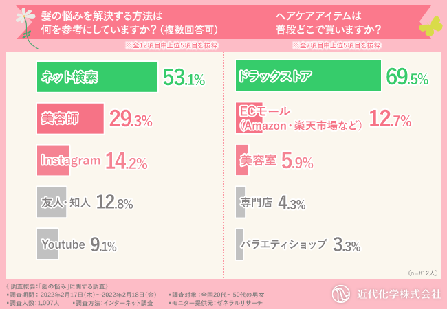 「ヘアケアアイテムは普段どこで買いますか?」と質問したところ、『ドラッグストア(69.5%)』と回答した方が最も多く、次いで『ECモール(Amazon・楽天市場など)(12.7%)』、『美容室(5.9%)』、『専門店(4.3%)』『バラエティショップ(3.3%)』と続きました。
