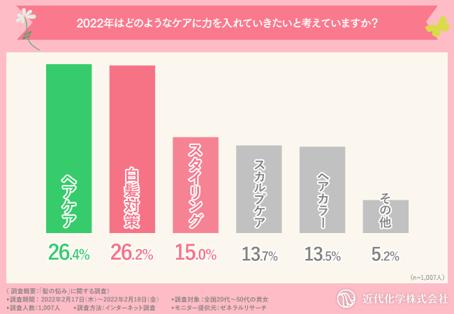 『ヘアケア工房』を運営する近代化学株式会社(本社所在地:神奈川県海老名市、代表取締役:岡部 達彦)は、全国20代~50代の男女を対象に「髪の悩み」に関する調査を行いました。