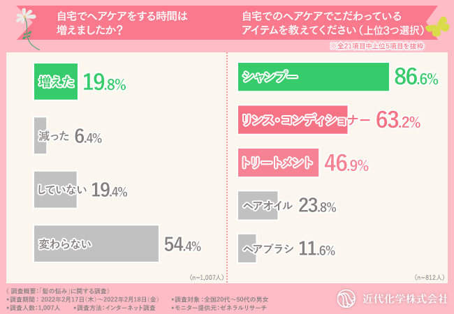 さらに自宅でヘアケアする時間が増えた方が多いことから、コロナ禍により悩みやその解決の仕方について変化がみられているようです。