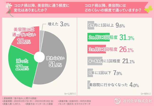 「コロナ禍以降、美容院に通う頻度に変化はありましたか?」と質問したところ、『変わらない(51.0%)』と回答した方が最も多かったものの、『減った(27.8%)』『美容院には通っていない(18.2%)』と、一定数変化が見られました。