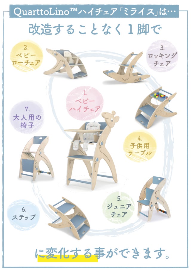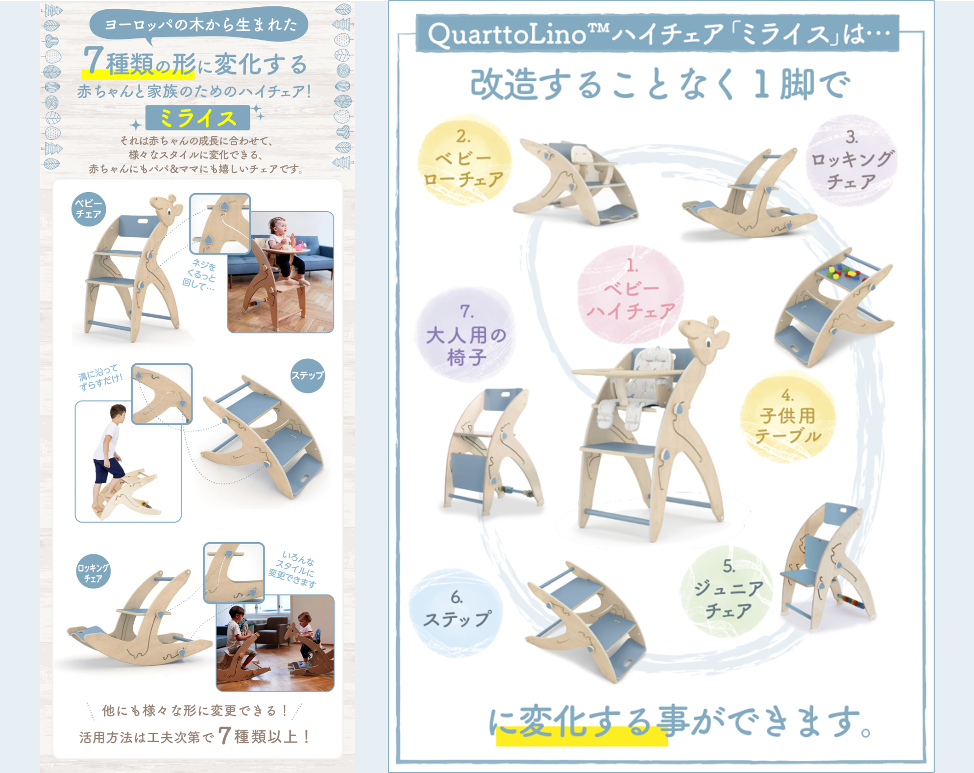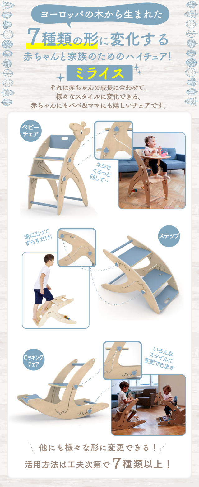 ミライスは、1台7役の多機能椅子です。側面のねじを緩めることで、7つの異なる機能をもったハイチェアやローチェア、木馬、ステップなどに変化します。